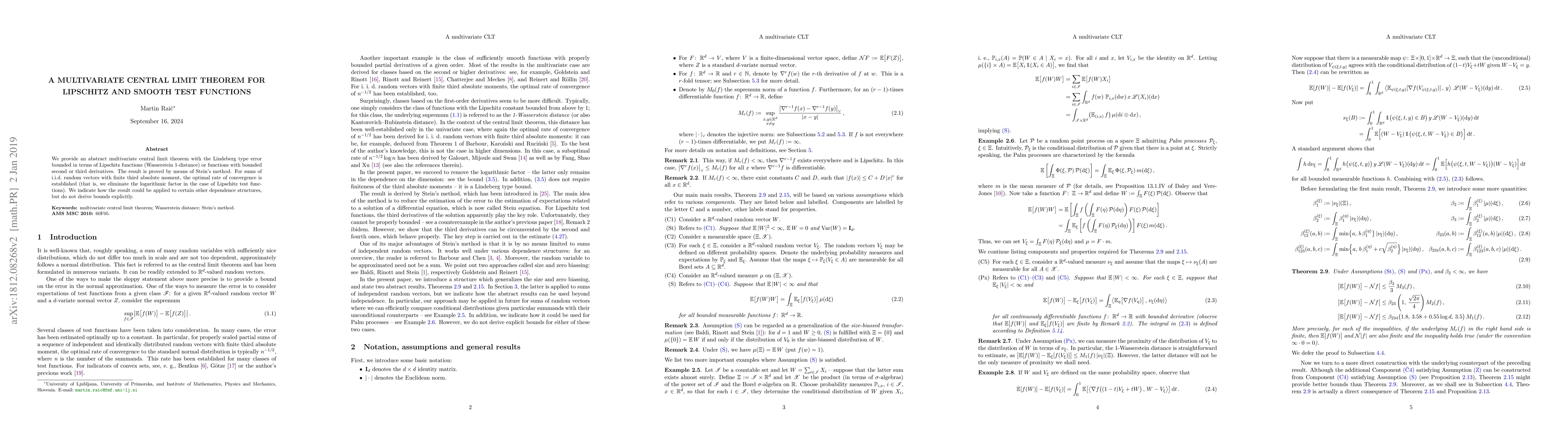 We provide an abstract multivariate central limit theorem with the Lindeberg-type error bounded in terms of Lipschitz functions (Wasserstein 1-distance) or functions with bounded second or third derivatives. The result is proved by means of Stein's method. For sums of i.i.d. random vectors with finite third absolute moment, the optimal rate of convergence is established (that is, we eliminate the logarithmic factor in the case of Lipschitz test functions). We indicate how the result could be applied to certain other dependence structures, but do not derive bounds explicitly.