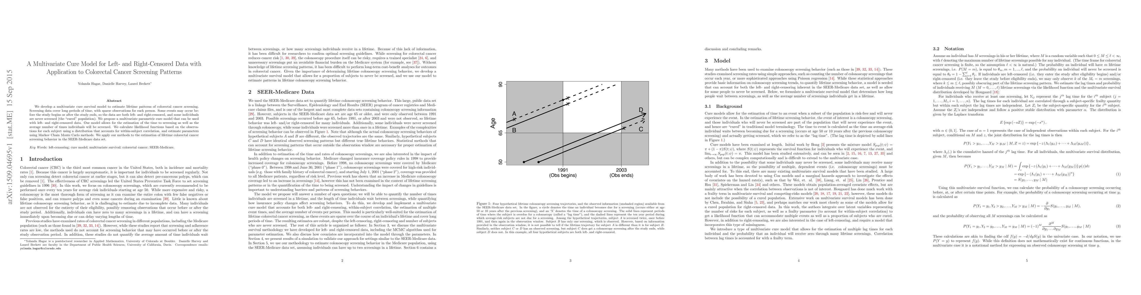 This paper introduces a multivariate cure model for analyzing left- and right-censored data, specifically applied to colorectal cancer screening patterns. The model estimates lifetime screening behavior and accounts for individuals who may never be screened, using Markov Chain Monte Carlo methods for parameter estimation.