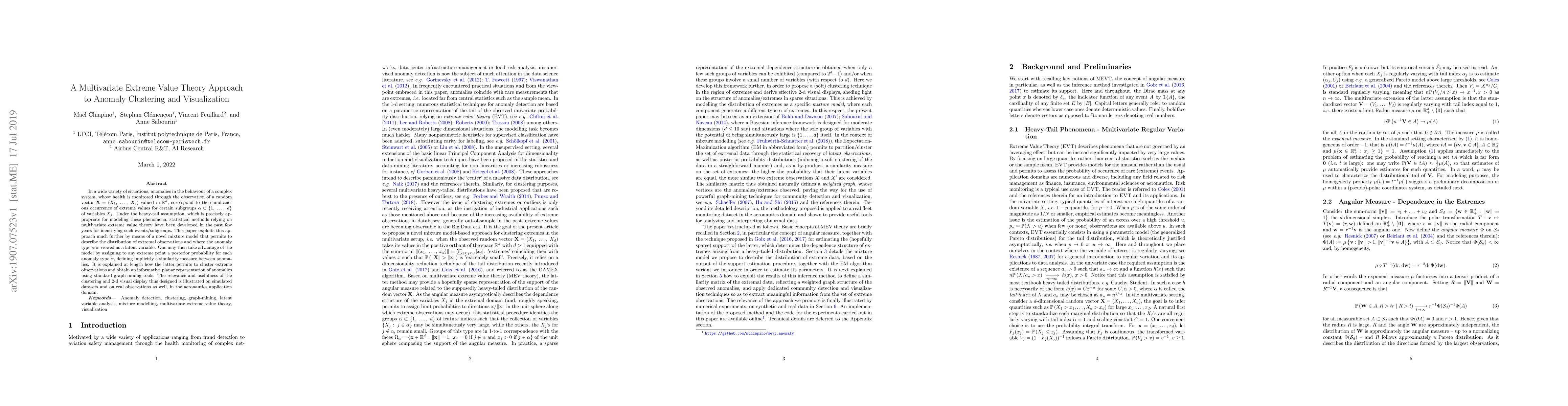 This paper develops a novel approach to anomaly clustering using multivariate extreme value theory, enabling the identification of similar anomalies and providing an informative 2D visual display.
