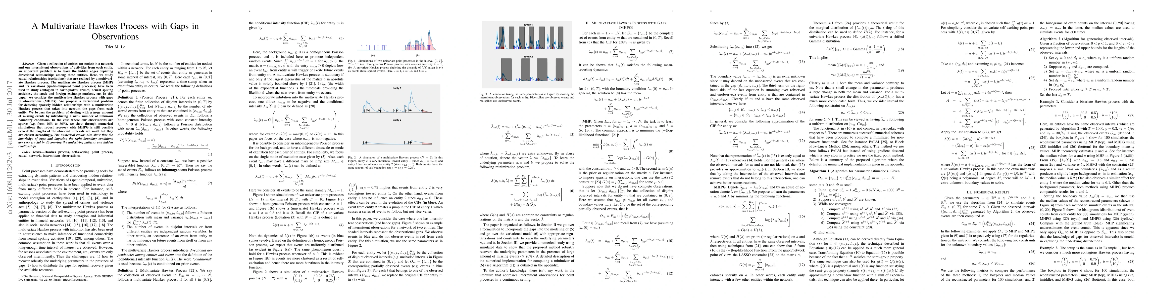 This paper proposes a multivariate Hawkes process with gaps in observations (MHPG) to detect hidden directional relationships among entities in a network, even with sparse data. It introduces a variational problem and boundary conditions to handle missing events, demonstrating robust recovery of underlying patterns despite gaps in observations.