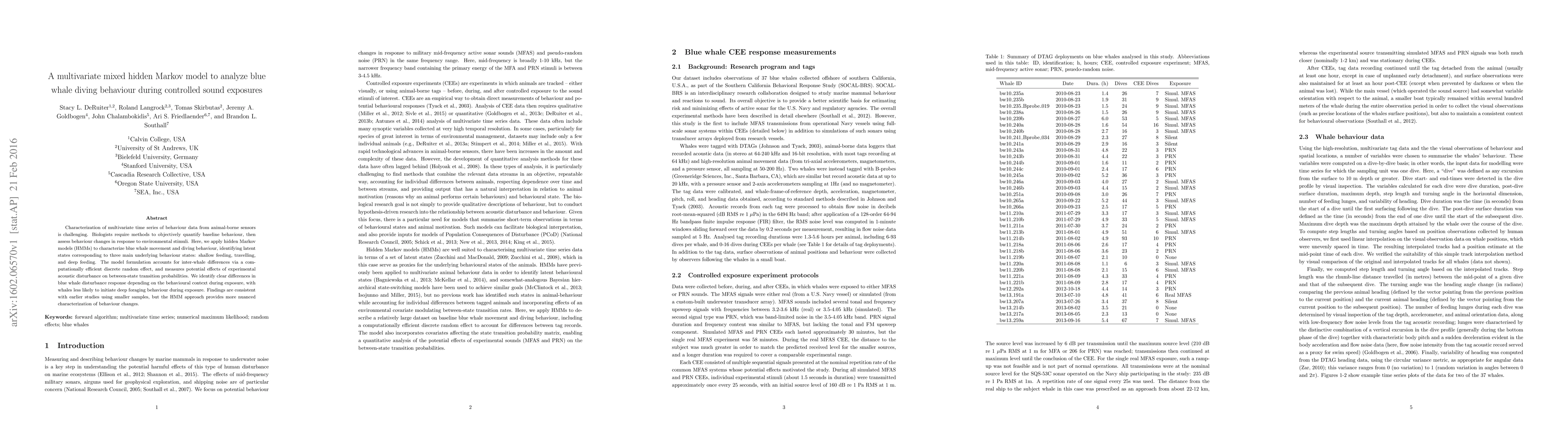 Characterization of multivariate time series of behaviour data from animal-borne sensors is challenging. Biologists require methods to objectively quantify baseline behaviour, then assess behaviour changes in response to environmental stimuli. Here, we apply hidden Markov models (HMMs) to characterize blue whale movement and diving behaviour, identifying latent states corresponding to three main underlying behaviour states: shallow feeding, travelling, and deep feeding. The model formulation accounts for inter-whale differences via a computationally efficient discrete random effect, and measures potential effects of experimental acoustic disturbance on between-state transition probabilities. We identify clear differences in blue whale disturbance response depending on the behavioural context during exposure, with whales less likely to initiate deep foraging behaviour during exposure. Findings are consistent with earlier studies using smaller samples, but the HMM approach provides more nuanced characterization of behaviour changes.