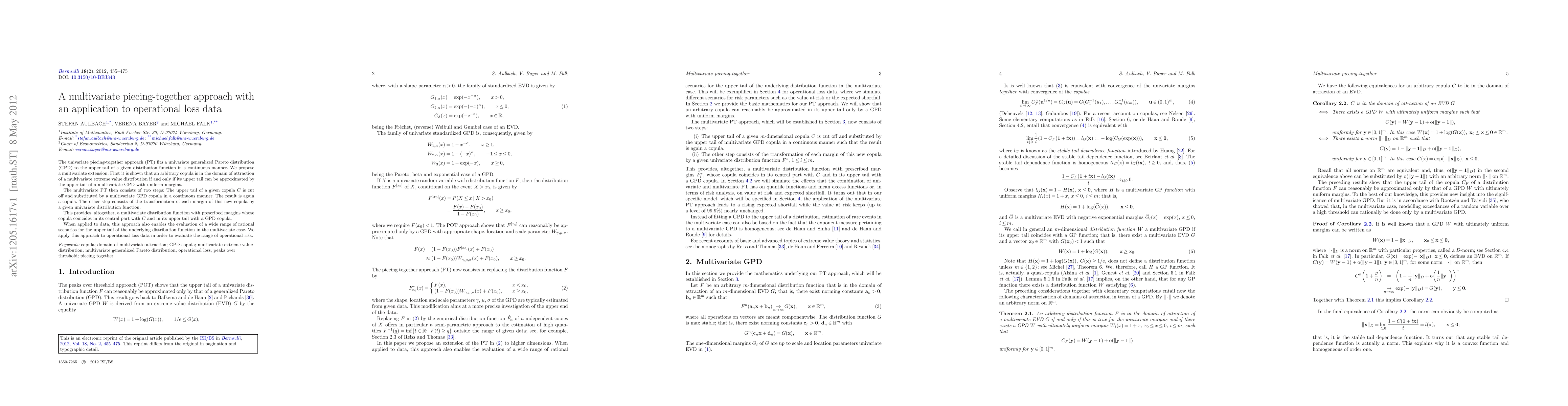 The univariate piecing-together approach (PT) fits a univariate generalized Pareto distribution (GPD) to the upper tail of a given distribution function in a continuous manner. We propose a multivariate extension. First it is shown that an arbitrary copula is in the domain of attraction of a multivariate extreme value distribution if and only if its upper tail can be approximated by the upper tail of a multivariate GPD with uniform margins. The multivariate PT then consists of two steps: The upper tail of a given copula $C$ is cut off and substituted by a multivariate GPD copula in a continuous manner. The result is again a copula. The other step consists of the transformation of each margin of this new copula by a given univariate distribution function. This provides, altogether, a multivariate distribution function with prescribed margins whose copula coincides in its central part with $C$ and in its upper tail with a GPD copula. When applied to data, this approach also enables the evaluation of a wide range of rational scenarios for the upper tail of the underlying distribution function in the multivariate case. We apply this approach to operational loss data in order to evaluate the range of operational risk.