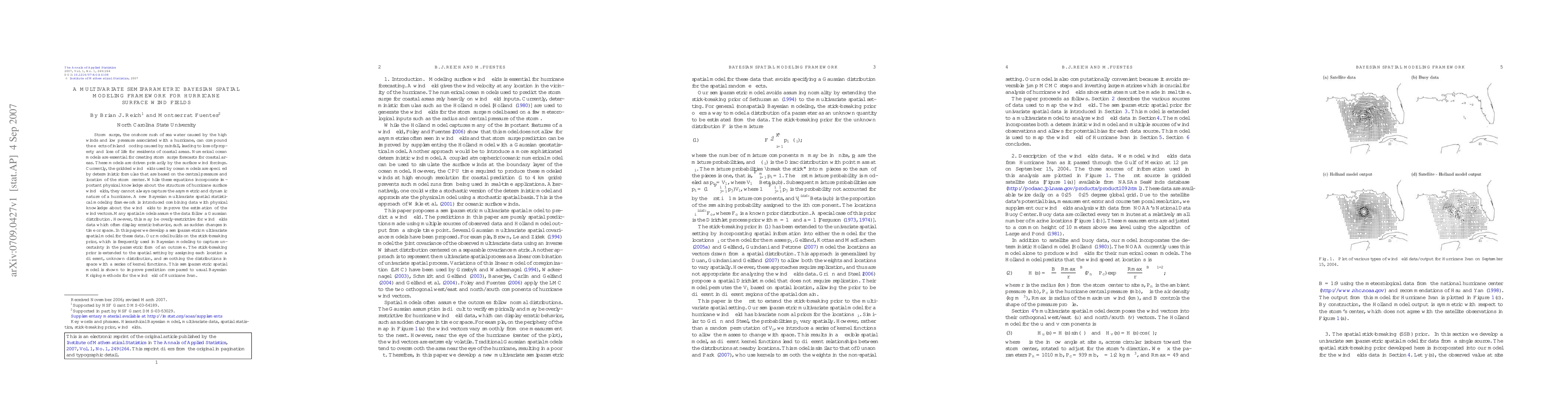 This paper introduces a new semiparametric Bayesian spatial modeling framework for estimating hurricane surface wind fields, combining data with physical knowledge to improve wind vector estimation. The proposed model uses a stick-breaking prior to capture the dynamic and asymmetric nature of hurricanes, outperforming traditional Gaussian-based Bayesian Kriging methods, as demonstrated with Hurricane Ivan.