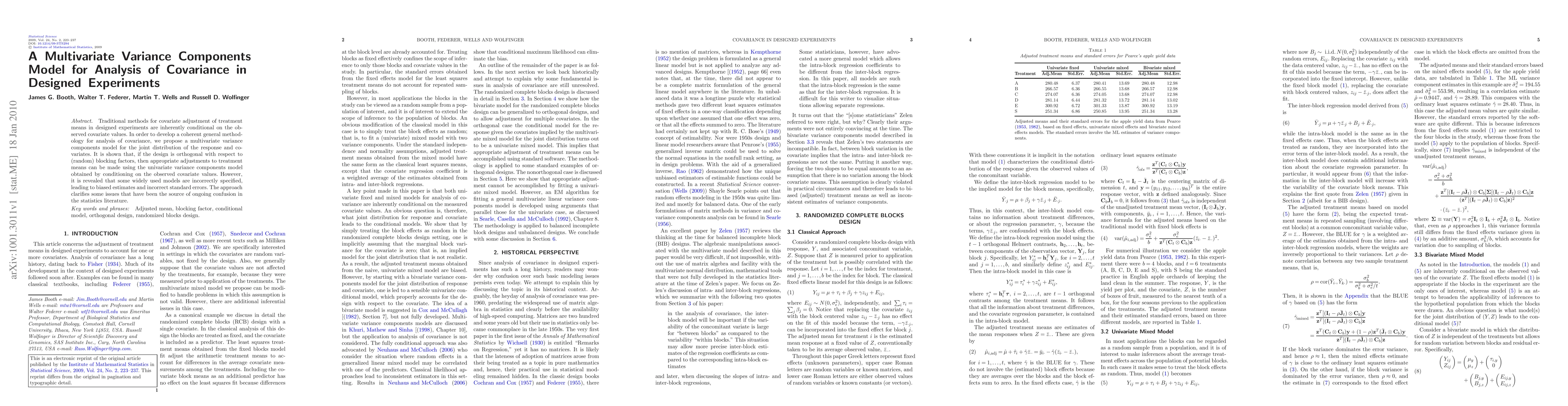 Traditional methods for covariate adjustment of treatment means in designed experiments are inherently conditional on the observed covariate values. In order to develop a coherent general methodology for analysis of covariance, we propose a multivariate variance components model for the joint distribution of the response and covariates. It is shown that, if the design is orthogonal with respect to (random) blocking factors, then appropriate adjustments to treatment means can be made using the univariate variance components model obtained by conditioning on the observed covariate values. However, it is revealed that some widely used models are incorrectly specified, leading to biased estimates and incorrect standard errors. The approach clarifies some issues that have been the source of ongoing confusion in the statistics literature.