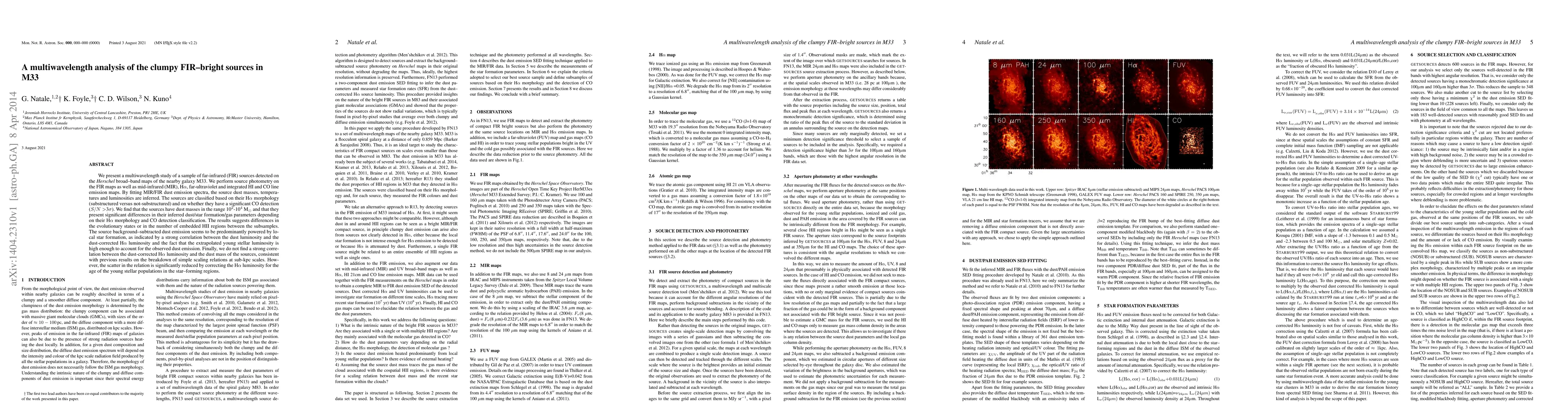 We present a multiwavelength study of a sample of far-infrared (FIR) sources detected on the Herschel broad--band maps of the nearby galaxy M33. We perform source photometry on the FIR maps as well as mid-infrared (MIR), H$\alpha$, far-ultraviolet and integrated HI and CO line emission maps. By fitting MIR/FIR dust emission spectra, the source dust masses, temperatures and luminosities are inferred. The sources are classified based on their H$\alpha$ morphology (substructured versus not-substructured) and on whether they have a significant CO detection ($S/N>$3$\sigma$). We find that the sources have dust masses in the range 10$^2$-10$^4$~M$_\odot$ and that they present significant differences in their inferred dust/star formation/gas parameters depending on their H$\alpha$ morphology and CO detection classification. The results suggests differences in the evolutionary states or in the number of embedded HII regions between the subsamples. The source background--subtracted dust emission seems to be predominantly powered by local star formation, as indicated by a strong correlation between the dust luminosity and the dust-corrected H$\alpha$ luminosity and the fact that the extrapolated young stellar luminosity is high enough to account for the observed dust emission. Finally, we do not find a strong correlation between the dust-corrected H$\alpha$ luminosity and the dust mass of the sources, consistent with previous results on the breakdown of simple scaling relations at sub-kpc scales. However, the scatter in the relation is significantly reduced by correcting the H$\alpha$ luminosity for the age of the young stellar populations in the star--forming regions.