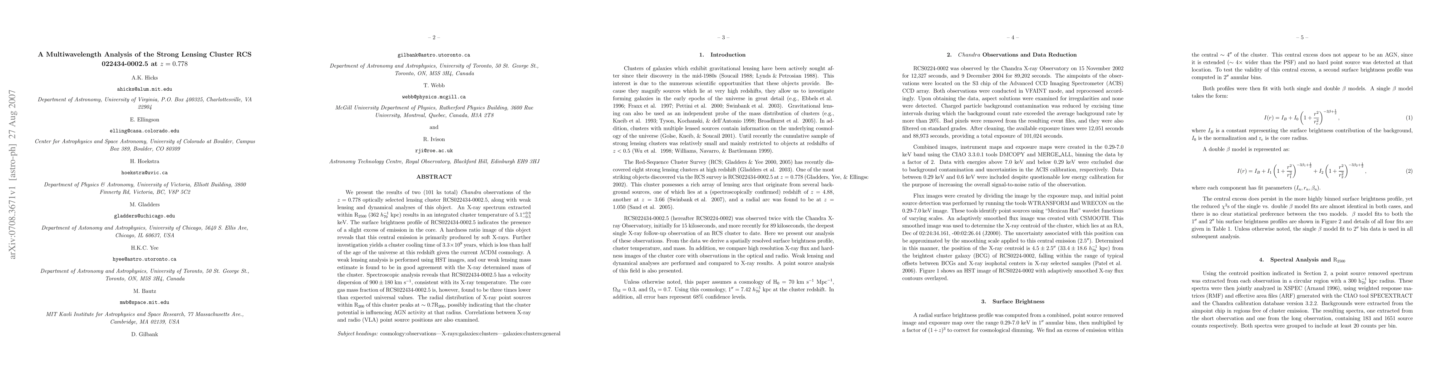 We present the results of two (101 ks total) Chandra observations of the z=0.778 optically selected lensing cluster RCS022434-0002.5, along with weak lensing and dynamical analyses of this object. An X-ray spectrum extracted within R(2500) (362 h(70)^(-1) kpc) results in an integrated cluster temperature of 5.1 (+0.9,-0.5) keV. The surface brightness profile of RCS022434-0002.5 indicates the presence of a slight excess of emission in the core. A hardness ratio image of this object reveals that this central emission is primarily produced by soft X-rays. Further investigation yields a cluster cooling time of 3.3 times 10^9 years, which is less than half of the age of the universe at this redshift given the current LCDM cosmology. A weak lensing analysis is performed using HST images, and our weak lensing mass estimate is found to be in good agreement with the X-ray determined mass of the cluster. Spectroscopic analysis reveals that RCS022434-0002.5 has a velocity dispersion of 900 +/- 180 km/s, consistent with its X-ray temperature. The core gas mass fraction of RCS022434-0002.5 is, however, found to be three times lower than expected universal values. The radial distribution of X-ray point sources within R(200) of this cluster peaks at ~0.7 R(200), possibly indicating that the cluster potential is influencing AGN activity at that radius. Correlations between X-ray and radio (VLA) point source positions are also examined.