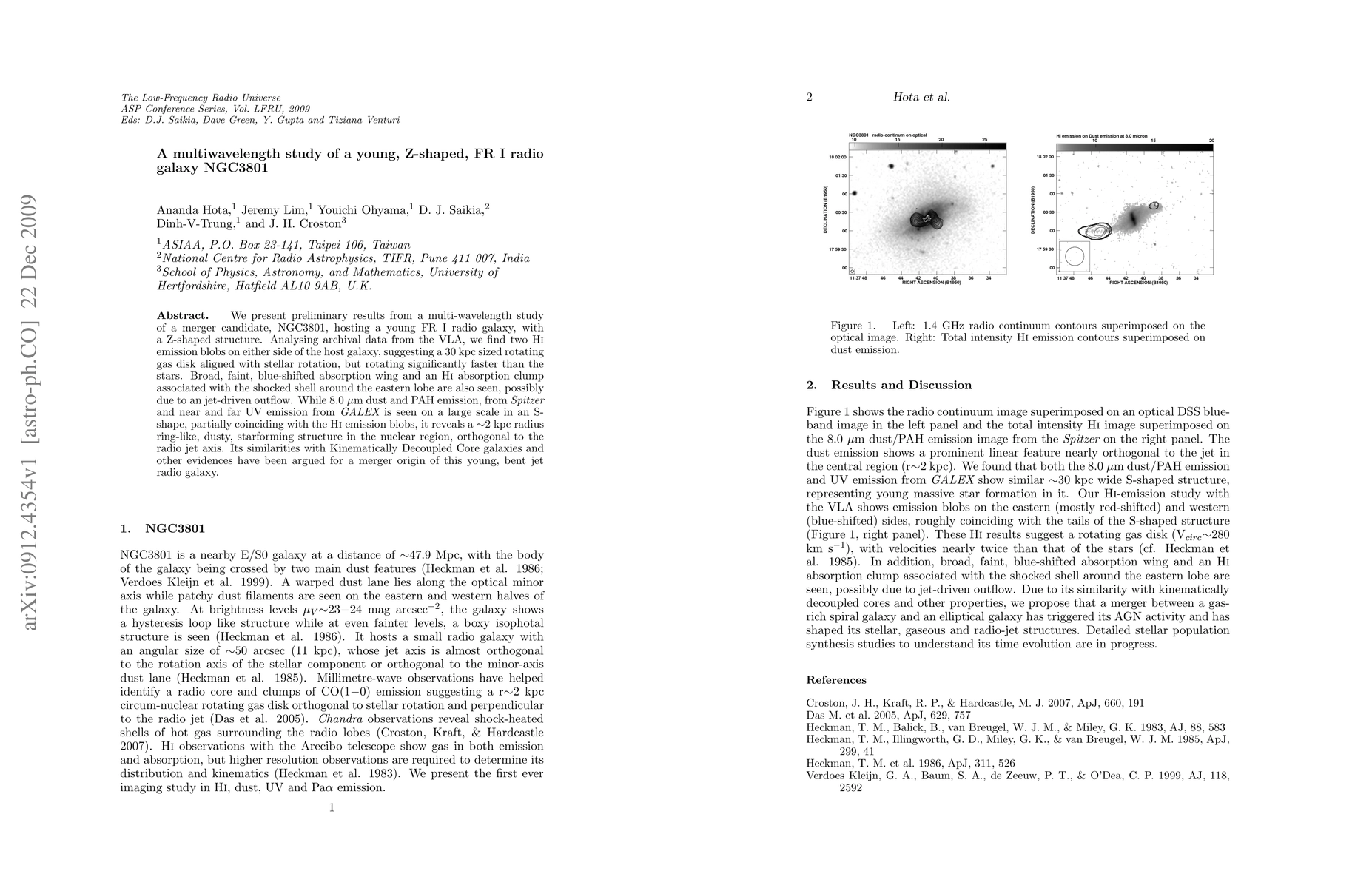 We present preliminary results from a multi-wavelength study of a merger candidate, NGC3801, hosting a young FR I radio galaxy, with a Z-shaped structure. Analysing archival data from the VLA, we find two HI emission blobs on either side of the host galaxy, suggesting a 30 kpc sized rotating gas disk aligned with stellar rotation, but rotating significantly faster than the stars. Broad, faint, blue-shifted absorption wing and an HI absorption clump associated with the shocked shell around the eastern lobe are also seen, possibly due to an jet-driven outflow. While 8.0 um dust and PAH emission, from Spitzer and near and far UV emission from GALEX is seen on a large scale in an S-shape, partially coinciding with the HI emission blobs, it reveals a ~2 kpc radius ring-like, dusty, starforming structure in the nuclear region, orthogonal to the radio jet axis. Its similarities with Kinematically Decoupled Core galaxies and other evidences have been argued for a merger origin of this young, bent jet radio galaxy.
