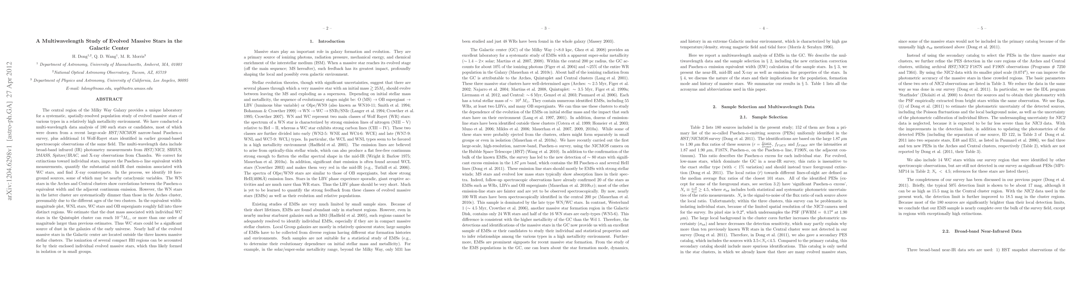The central region of the Milky Way provides a unique laboratory for a systematic, spatially-resolved population study of evolved massive stars of various types in a relatively high metallicity environment. We have conducted a multi-wavelength data analysis of 180 such stars or candidates, most of which were drawn from a recent large-scale HST/NICMOS narrow-band Pa-a survey, plus additional 14 Wolf-Rayet stars identified in earlier ground-based spectroscopic observations of the same field. The multi-wavelength data include broad-band IR photometry measurements from HST/NICMOS, SIRIUS, 2MASS, Spitzer/IRAC, and Chandra X-ray observations. We correct for extinctions toward individual stars, improve the Pa-a line equivalent width measurements, quantify the substantial mid-IR dust emission associated with WC stars, and find X-ray counterparts. In the process, we identify 10 foreground sources, some of which may be nearby cataclysmic variables. The WN stars in the Arches and Central clusters show correlations between the Pa-a equivalent width and the adjacent continuum emission. However, the WN stars in the latter cluster are systematically dimmer than those in the Arches cluster, presumably due to the different ages of the two clusters. In the EW-magnitude plot, WNL stars, WC stars and OB supergiants roughly fall into three distinct regions. We estimate that the dust mass associated with individual WC stars in the Quintuplet cluster can reach 1e-5 M, or more than one order of magnitude larger than previous estimates. Thus WC stars could be a significant source of dust in the galaxies of the early universe. Nearly half of the evolved massive stars in the GC are located outside the three known massive stellar clusters. The ionization of several compact HII regions can be accounted for by their enclosed individual evolved massive stars, which thus likely formed in isolation or in small groups.