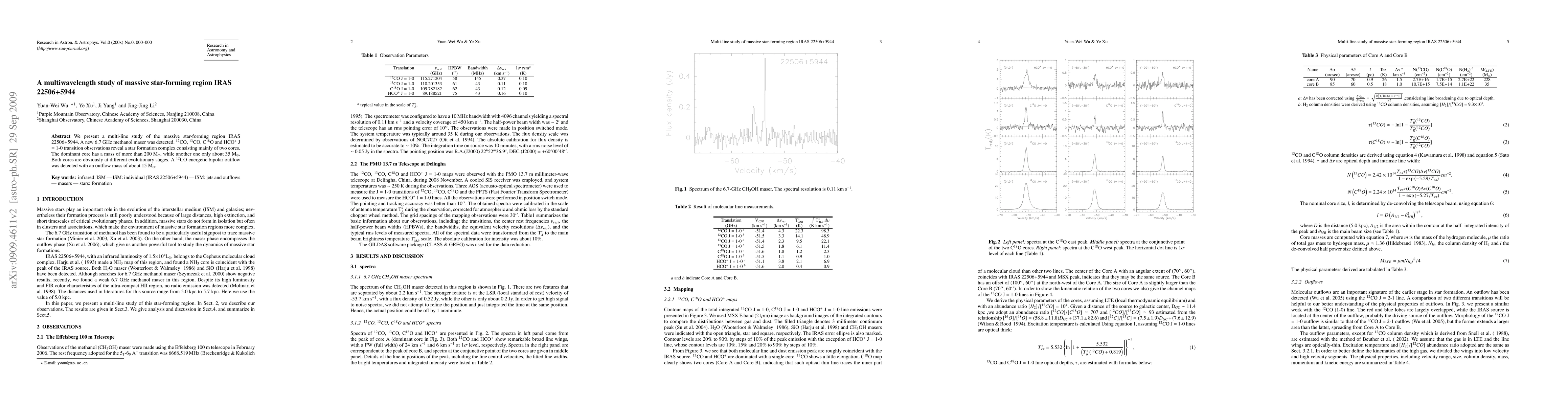 This study identifies a massive star-forming region IRAS 22506+5944, revealing two distinct cores with masses of over 200 and 35 solar masses respectively, and detects a new methanol maser, CO outflows, and varying evolutionary stages.