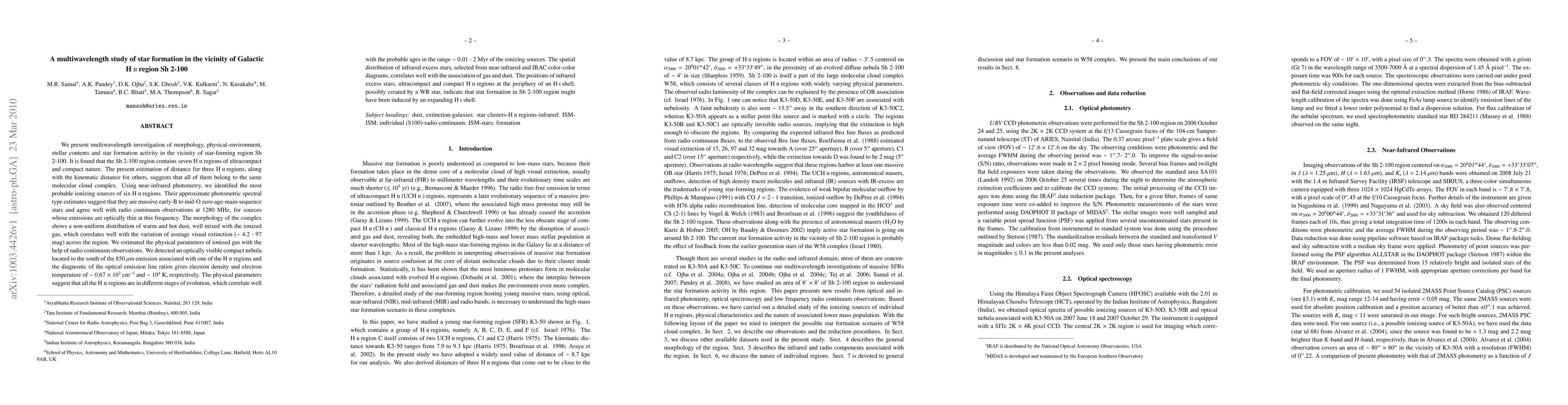 We present multiwavelength investigation of morphology, physical-environment, stellar contents and star formation activity in the vicinity of star-forming region Sh 2-100. It is found that the Sh 2-100 region contains seven HII regions of ultracompact and compact nature. The present estimation of distance for three HII regions, along with the kinematic distance for others, suggests that all of them belong to the same molecular cloud complex. Using NIR photometry, we identified the most probable ionizing sources of six HII regions. Their approximate photometric spectral type estimates suggest that they are massive early-B to mid-O ZAMS stars and agree well with radio continuum observations at 1280 MHz. The morphology of the complex shows a non-uniform distribution of warm and hot dust, well mixed with the ionized gas, which correlates well with the variation of average visual extinction (~ 4.2 - 97 mag) across the region. We estimated the physical parameters of ionized gas with the help of radio continuum observations. We detected an optically visible compact nebula located to the south of the 850 micron emission associated with one of the HII regions and the diagnostic of the optical emission line ratios gives electron density and electron temperature of ~ 0.67 x 10^3 cm^-3 and ~ 10^4 K, respectively. The physical parameters suggest that all the HII regions are in different stages of evolution, which correlate well with the probable ages in the range ~ 0.01 - 2 Myr of the ionizing sources. The positions of IR excess stars, ultracompact and compact HII regions at the periphery of an HI shell, possibly created by a WR star, indicate that star formation in Sh 2-100 region might have been induced by an expanding HI shell.