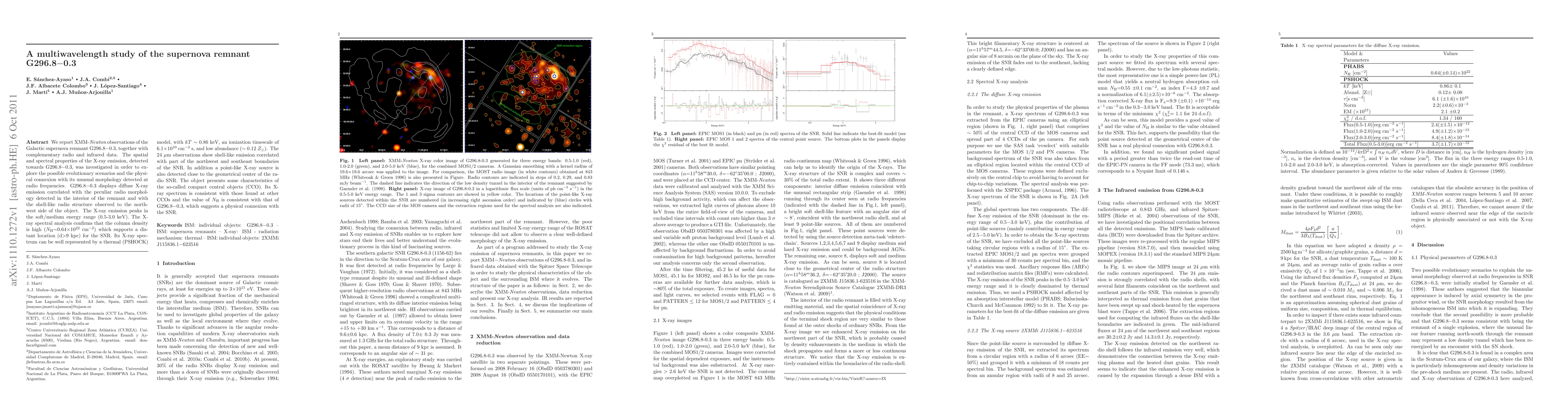 We report XMM-Newton observations of the Galactic supernova remnant G296.8-0.3, together with complementary radio and infrared data. The spatial and spectral properties of the X-ray emission, detected towards G296.8-0.3, was investigated in order to explore the possible evolutionary scenarios and the physical connexion with its unusual morphology detected at radio frequencies. G296.8-0.3 displays diffuse X-ray emission correlated with the peculiar radio morphology detected in the interior of the remnant and with the shell-like radio structure observed to the northwest side of the object. The X-ray emission peaks in the soft/medium energy range (0.5-3.0 keV). The X-ray spectral analysis confirms that the column density is high (NH \sim 0.64 x 10^{22} cm^{-2}) which supports a distant location (d>9 kpc) for the SNR. Its X-ray spectrum can be well represented by a thermal (PSHOCK) model, with kT \sim 0.86 keV, an ionization timescale of 6.1 x 10^{10} cm^{-3} s, and low abundance (0.12 Z_sun). The 24 microns observations show shell-like emission correlated with part of the northwest and southeast boundaries of the SNR. In addition a point-like X-ray source is also detected close to the geometrical center of the radio SNR. The object presents some characteristics of the so-called compact central objects (CCO). Its X-ray spectrum is consistent with those found at other CCOs and the value of NH is consistent with that of G296.8-0.3, which suggests a physical connexion with the SNR.