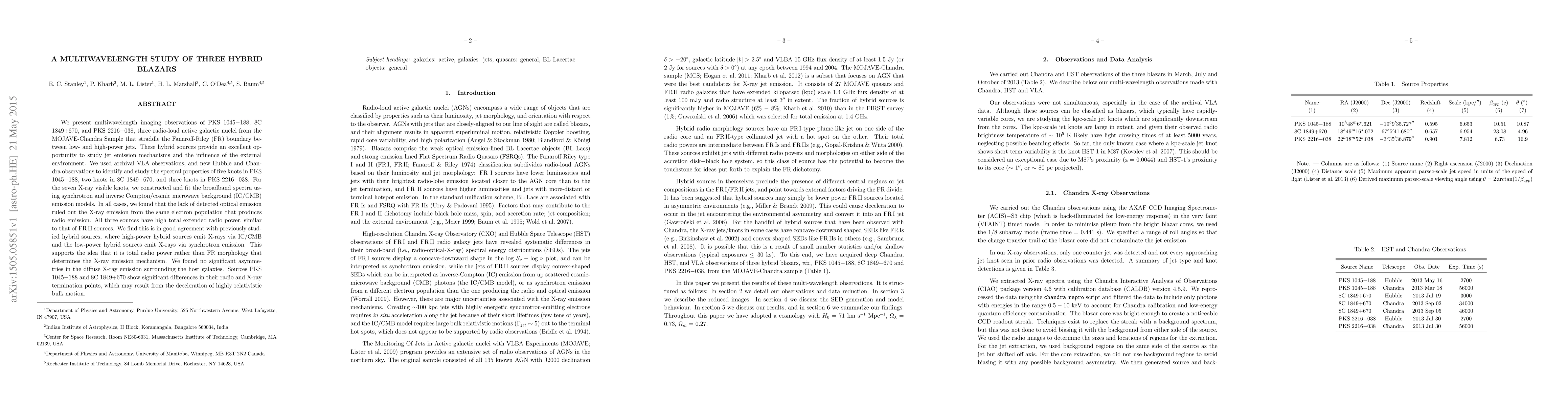 This paper presents multiwavelength observations of three hybrid blazars straddling the Fanaroff-Riley classification boundary, revealing that total radio power, rather than morphology, determines X-ray emission mechanisms. The study found no significant asymmetries in the X-ray emission surrounding the host galaxies, suggesting differences in jet termination points may result from relativistic bulk motion deceleration.