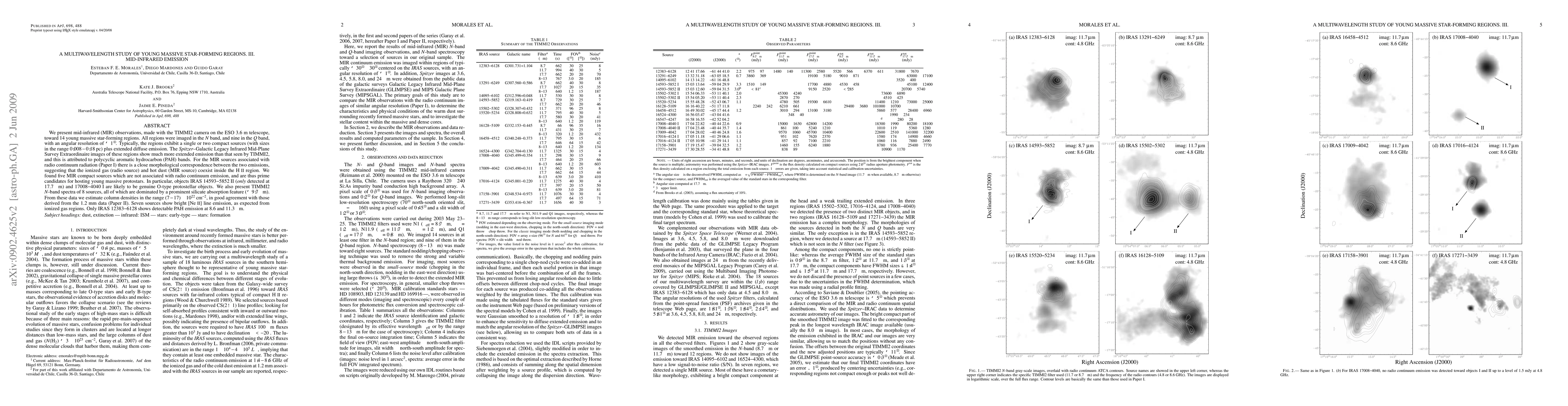We present mid-infrared (MIR) observations, made with the TIMMI2 camera on the ESO 3.6 m telescope, toward 14 young massive star-forming regions. All regions were imaged in the N band, and nine in the Q band, with an angular resolution of ~ 1 arcsec. Typically, the regions exhibit a single or two compact sources (with sizes in the range 0.008-0.18 pc) plus extended diffuse emission. The Spitzer-Galactic Legacy Infrared Mid-Plane Survey Extraordinaire images of these regions show much more extended emission than that seen by TIMMI2, and this is attributed to polycyclic aromatic hydrocarbon (PAH) bands. For the MIR sources associated with radio continuum radiation (Paper I) there is a close morphological correspondence between the two emissions, suggesting that the ionized gas (radio source) and hot dust (MIR source) coexist inside the H II region. We found five MIR compact sources which are not associated with radio continuum emission, and are thus prime candidates for hosting young massive protostars. In particular, objects IRAS 14593-5852 II (only detected at 17.7 microns) and 17008-4040 I are likely to be genuine O-type protostellar objects. We also present TIMMI2 N-band spectra of eight sources, all of which are dominated by a prominent silicate absorption feature (~ 9.7 microns). From these data we estimate column densities in the range (7-17)x10^22 cm^-2, in good agreement with those derived from the 1.2 mm data (Paper II). Seven sources show bright [Ne II] line emission, as expected from ionized gas regions. Only IRAS 123830-6128 shows detectable PAH emission at 8.6 and 11.3 microns.