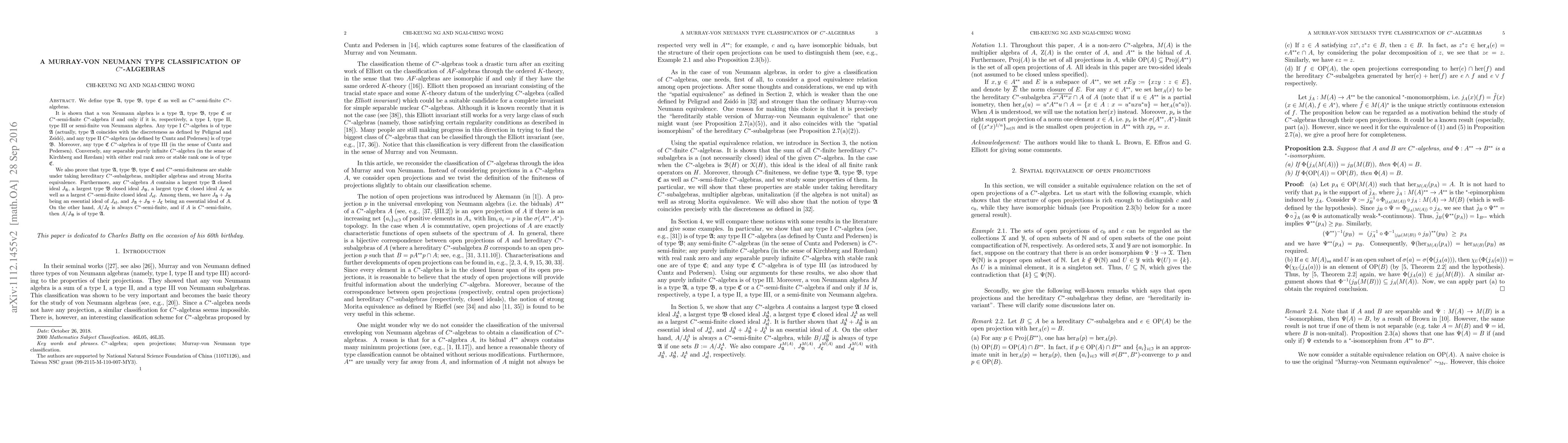 We define type $\mathfrak{A}$, type $\mathfrak{B}$, type $\mathfrak{C}$ as well as C*-semi-finite C*-algebras. It is shown that a von Neumann algebra is a type $\mathfrak{A}$, type $\mathfrak{B}$, type $\mathfrak{C}$ or C*-semi-finite C*-algebra if and only if it is, respectively, a type I, type II, type III or semi-finite von Neumann algebra. Any type I C*-algebra is of type $\mathfrak{A}$ (actually, type $\mathfrak{A}$ coincides with the discreteness as defined by Peligrad and Zsido), and any type II C*-algebra (as defined by Cuntz and Pedersen) is of type $\mathfrak{B}$. Moreover, any type $\mathfrak{C}$ C*-algebra is of type III (in the sense of Cuntz and Pedersen). Furthermore, any purely infinite C*-algebra (in the sense of Kirchberg and Rordam) with real rank zero is of type $\mathfrak{C}$, and any separable purely infinite C*-algebra with stable rank one is also of type $\mathfrak{C}$. We also prove that type $\mathfrak{A}$, type $\mathfrak{B}$, type $\mathfrak{C}$ and C*-semi-finiteness are stable under taking hereditary C*-subalgebras, multiplier algebras and strong Morita equivalence. Furthermore, any C*-algebra $A$ contains a largest type $\mathfrak{A}$ closed ideal $J_\mathfrak{A}$, a largest type $\mathfrak{B}$ closed ideal $J_\mathfrak{B}$, a largest type $\mathfrak{C}$ closed ideal $J_\mathfrak{C}$ as well as a largest C*-semi-finite closed ideal $J_\mathfrak{sf}$. Among them, we have $J_\mathfrak{A} + J_\mathfrak{B}$ being an essential ideal of $J_\mathfrak{sf}$, and $J_\mathfrak{A} + J_\mathfrak{B} + J_\mathfrak{C}$ being an essential ideal of $A$. On the other hand, $A/J_\mathfrak{C}$ is always C*-semi-finite, and if $A$ is C*-semi-finite, then $A/J_\mathfrak{B}$ is of type $\mathfrak{A}$.