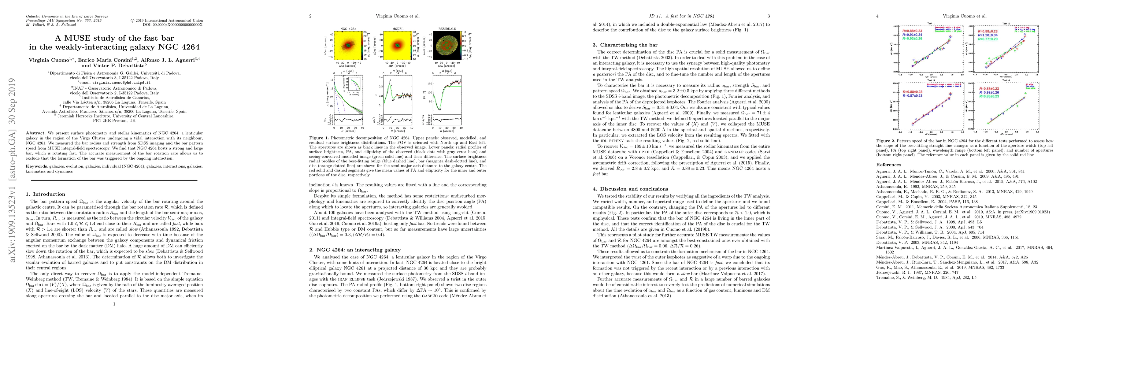 We present surface photometry and stellar kinematics of NGC 4264, a lenticular galaxy in the region of the Virgo Cluster undergoing a tidal interaction with its neighbour, NGC 4261. We measured the bar radius and strength from SDSS imaging and the bar pattern speed from MUSE integral-field spectroscopy. We find that NGC 4264 hosts a strong and large bar, which is rotating fast. The accurate measurement of the bar rotation rate allows us to exclude that the formation of the bar was triggered by the ongoing interaction.