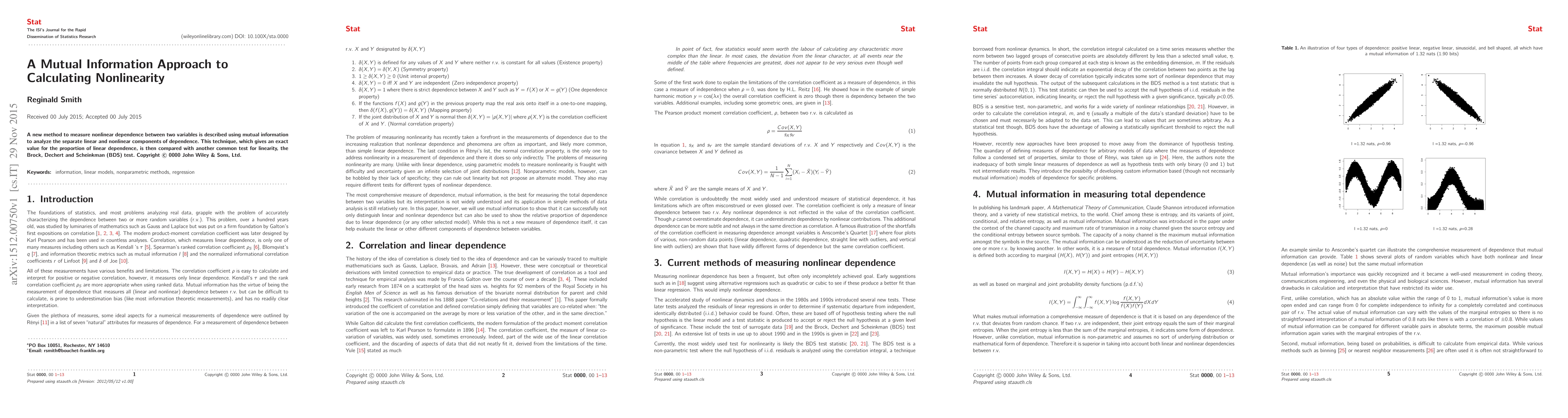 A new method to measure nonlinear dependence between two variables is described using mutual information to analyze the separate linear and nonlinear components of dependence. This technique, which gives an exact value for the proportion of linear dependence, is then compared with another common test for linearity, the Brock, Dechert and Scheinkman (BDS) test.