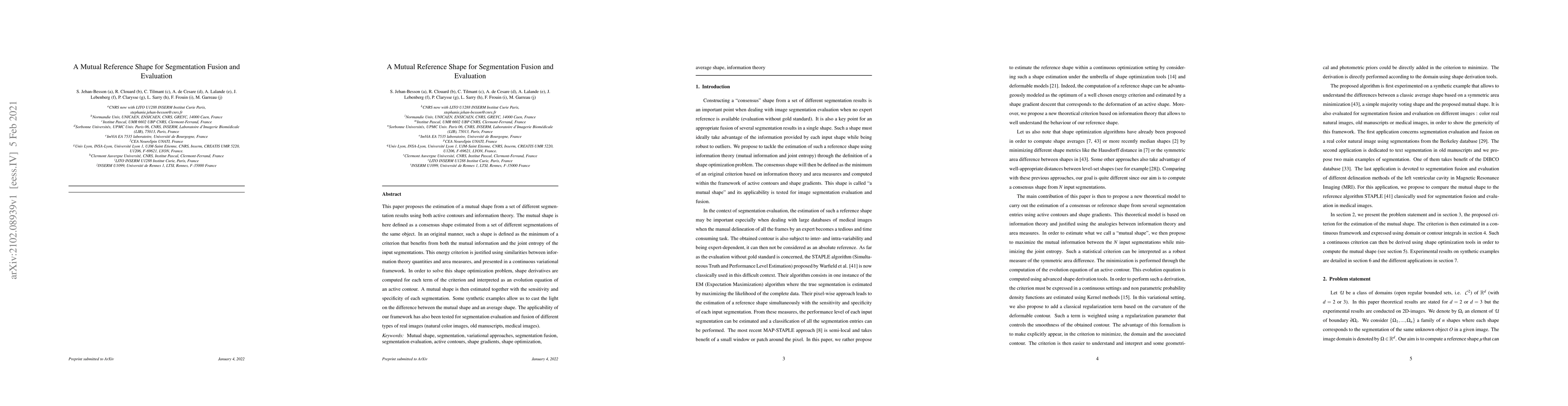 This paper introduces a method to estimate a consensus shape from multiple object segmentations using active contours and information theory. The consensus shape, or 'mutual shape', is defined as the minimum of a criterion combining mutual information and joint entropy. The approach is validated through synthetic examples and tested on various image types, demonstrating its applicability for segmentation evaluation and fusion.