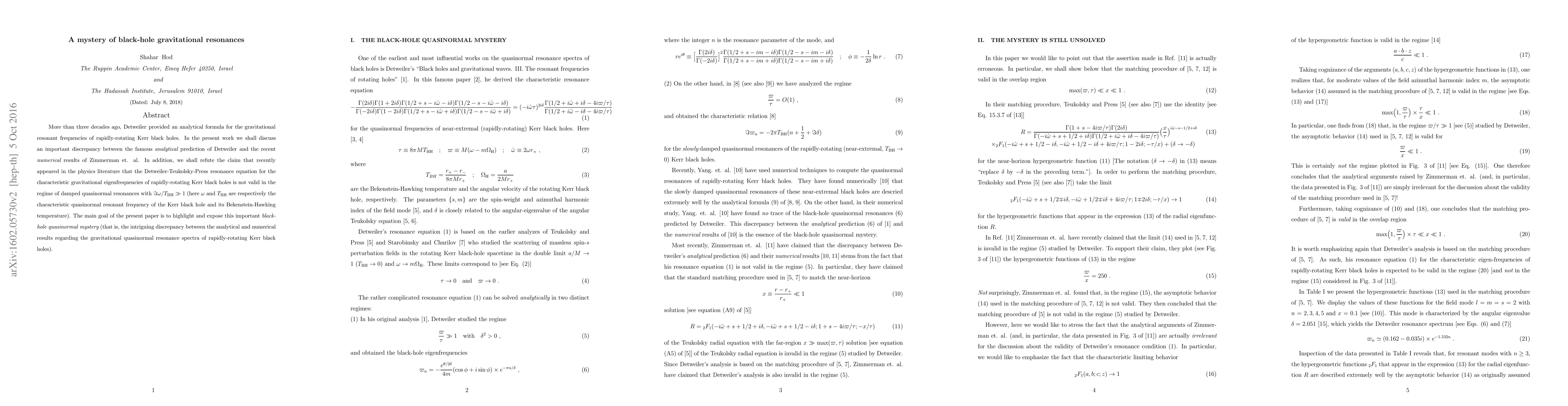More than three decades ago, Detweiler provided an analytical formula for the gravitational resonant frequencies of rapidly-rotating Kerr black holes. In the present work we shall discuss an important discrepancy between the famous {\it analytical} prediction of Detweiler and the recent {\it numerical} results of Zimmerman et. al. In addition, we shall refute the claim that recently appeared in the physics literature that the Detweiler-Teukolsky-Press resonance equation for the characteristic gravitational eigenfrequencies of rapidly-rotating Kerr black holes is not valid in the regime of damped quasinormal resonances with $\Im\omega/T_{\text{BH}}\gg1$ (here $\omega$ and $T_{\text{BH}}$ are respectively the characteristic quasinormal resonant frequency of the Kerr black hole and its Bekenstein-Hawking temperature). The main goal of the present paper is to highlight and expose this important {\it black-hole quasinormal mystery} (that is, the intriguing discrepancy between the analytical and numerical results regarding the gravitational quasinormal resonance spectra of rapidly-rotating Kerr black holes).