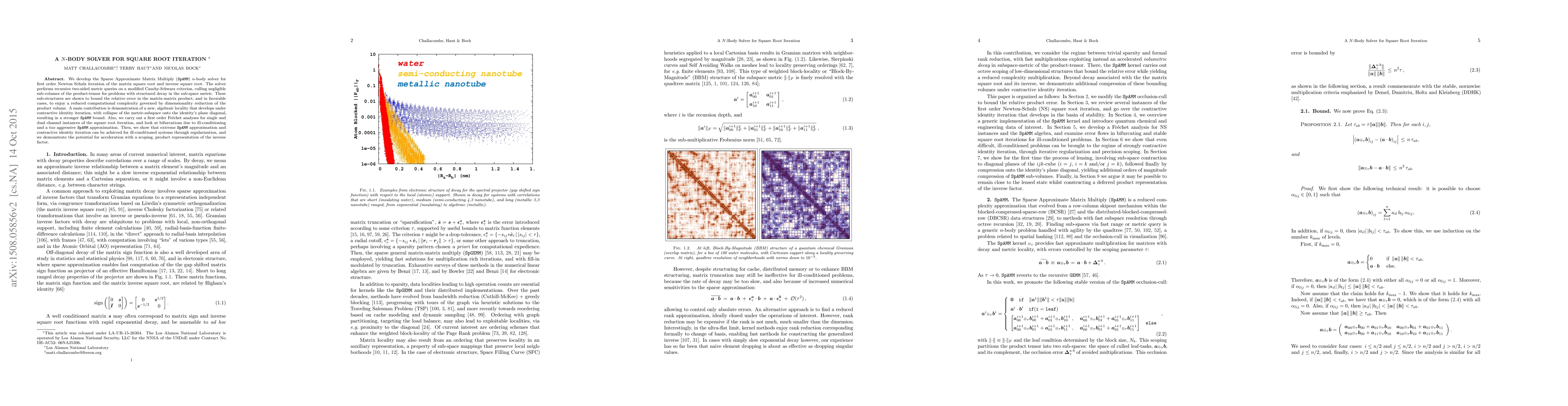 This paper introduces the Sparse Approximate Matrix Multiply ($SpAMM$) $n$-body solver for Newton Schulz iteration of matrix square root and inverse square root, leveraging recursive metric queries and dimensionality reduction to reduce computational complexity. The study also explores Fréchet analysis and regularization techniques for handling ill-conditioned systems.