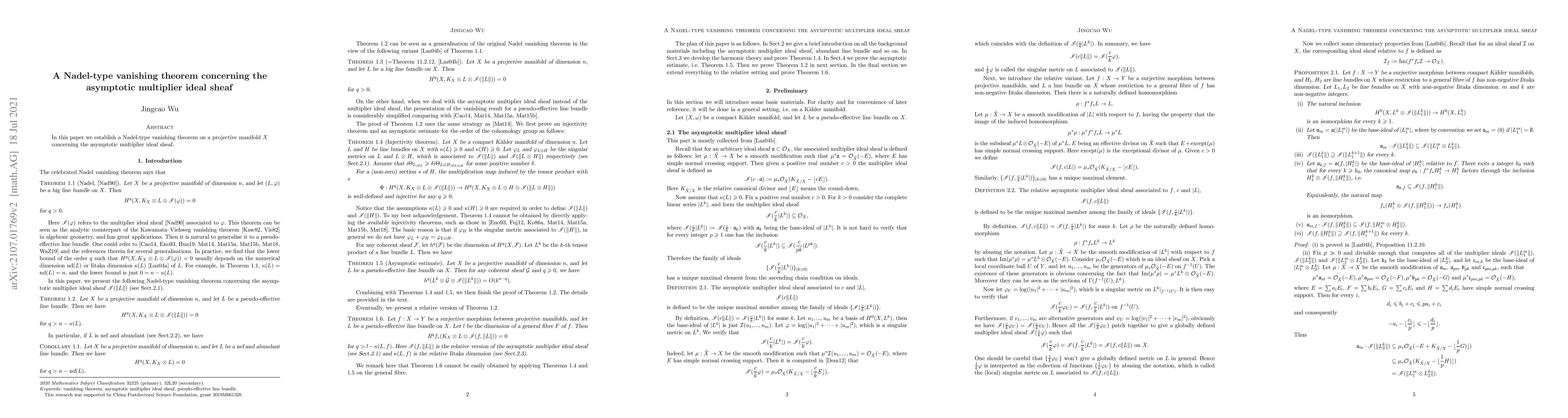 This paper establishes a Nadel-type vanishing theorem for projective manifolds regarding the asymptotic multiplier ideal sheaf, enhancing understanding of the vanishing properties of certain sheaves. The result contributes to the theory of complex geometry and sheaf cohomology.