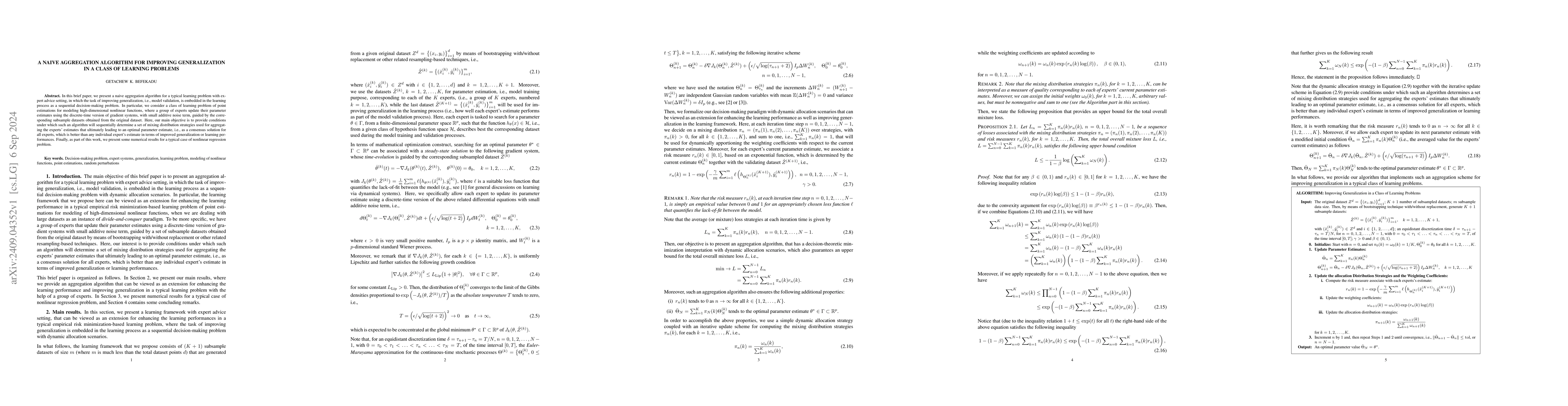 In this brief paper, we present a naive aggregation algorithm for a typical learning problem with expert advice setting, in which the task of improving generalization, i.e., model validation, is embedded in the learning process as a sequential decision-making problem. In particular, we consider a class of learning problem of point estimations for modeling high-dimensional nonlinear functions, where a group of experts update their parameter estimates using the discrete-time version of gradient systems, with small additive noise term, guided by the corresponding subsample datasets obtained from the original dataset. Here, our main objective is to provide conditions under which such an algorithm will sequentially determine a set of mixing distribution strategies used for aggregating the experts' estimates that ultimately leading to an optimal parameter estimate, i.e., as a consensus solution for all experts, which is better than any individual expert's estimate in terms of improved generalization or learning performances. Finally, as part of this work, we present some numerical results for a typical case of nonlinear regression problem.