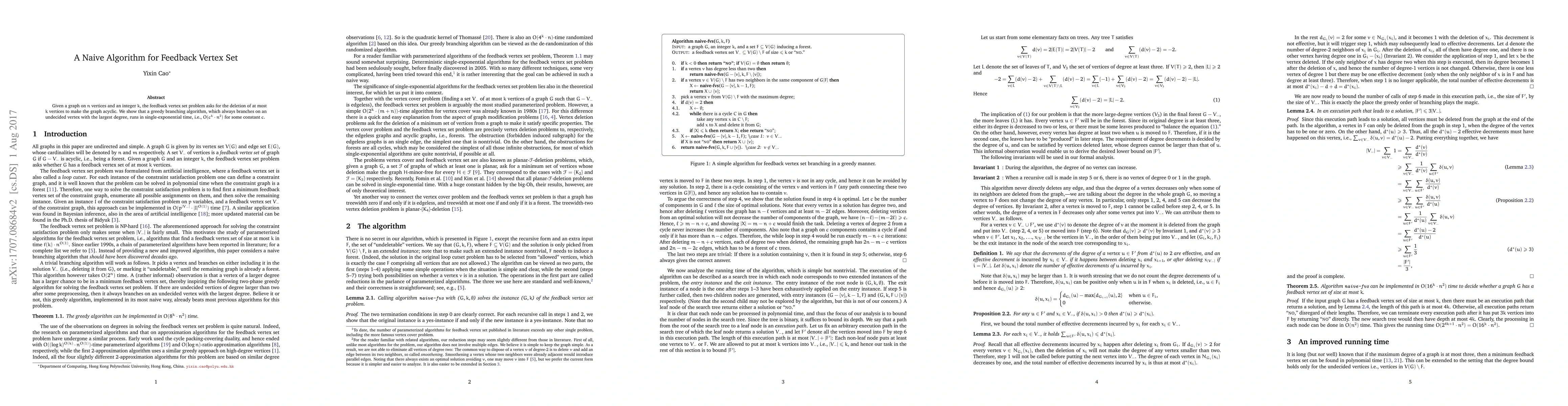 This paper presents a new algorithm for solving the Feedback Vertex Set problem in graphs, which involves finding the minimum number of vertices to remove to make the graph acyclic. The proposed algorithm, a greedy branching method that prioritizes vertices with the highest degree, runs in single-exponential time, specifically O(c^k*n^2), where c is a constant and k is the number of vertices to be removed.