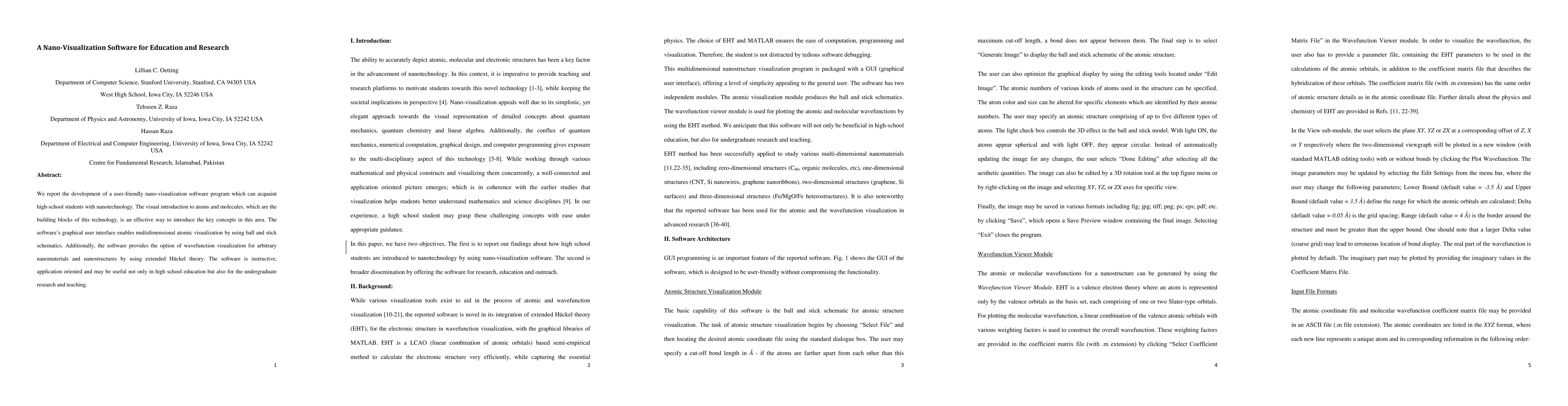 This paper introduces a user-friendly nano-visualization software designed to educate high-school students on nanotechnology, featuring multidimensional atomic visualization and wavefunction visualization for nanomaterials. It is also applicable for undergraduate research and teaching.