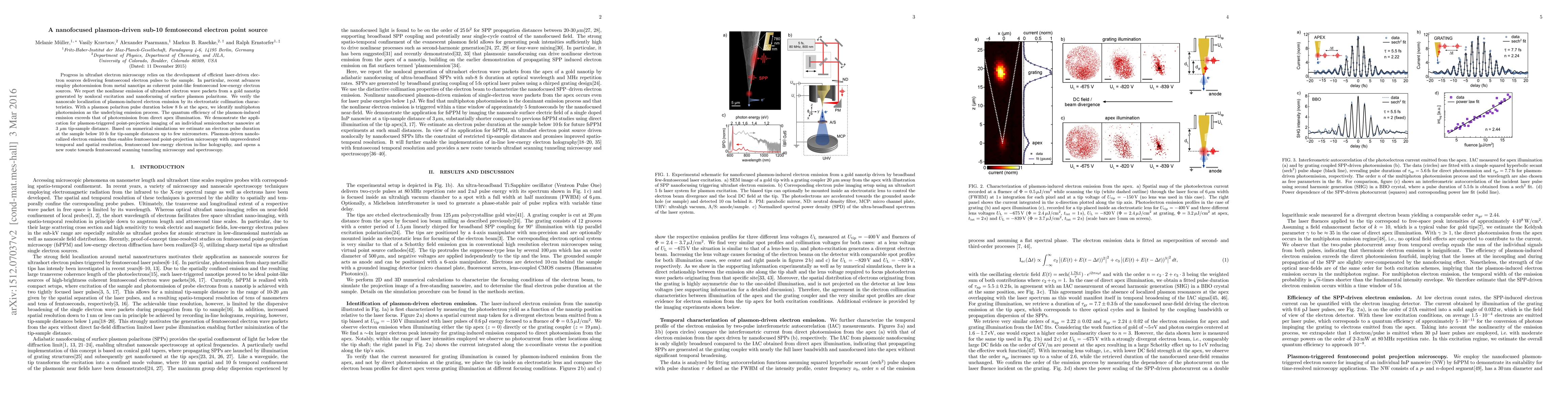 This paper reports the development of a femtosecond electron source using plasmon-driven emission from gold nanotips, achieving sub-10 femtosecond electron pulses. The study demonstrates the potential for femtosecond point-projection microscopy and low-energy electron in-line holography, with applications in scanning tunneling microscopy and spectroscopy.