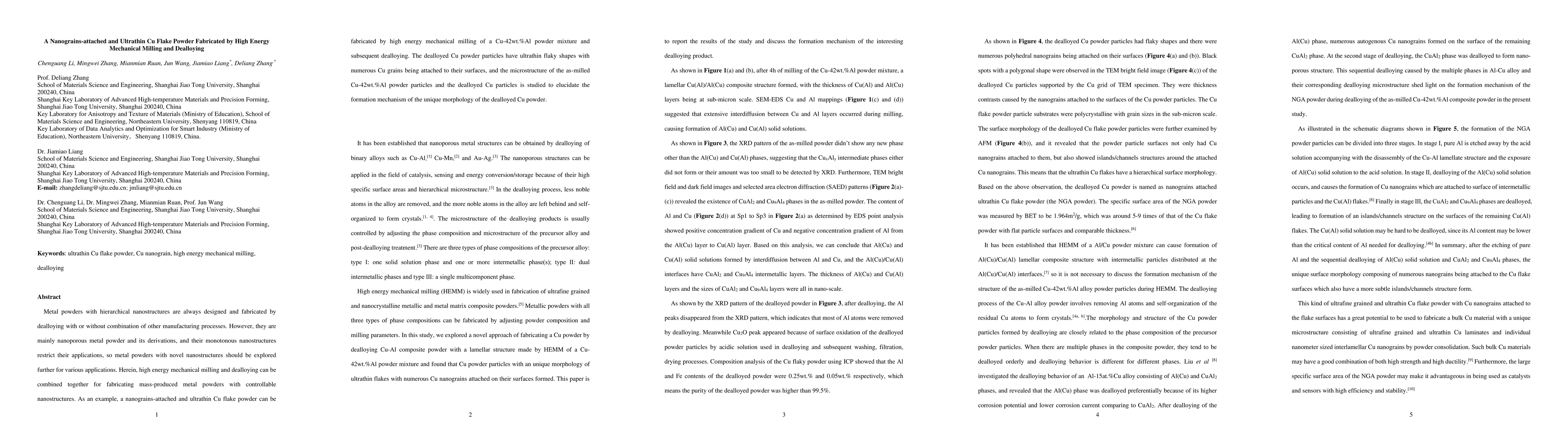This paper presents a method for fabricating ultrathin Cu flake powder with nanograins using high-energy mechanical milling and dealloying of Cu-42wt.%Al. The resulting Cu flakes exhibit unique nanostructures, enhancing their potential for diverse applications.