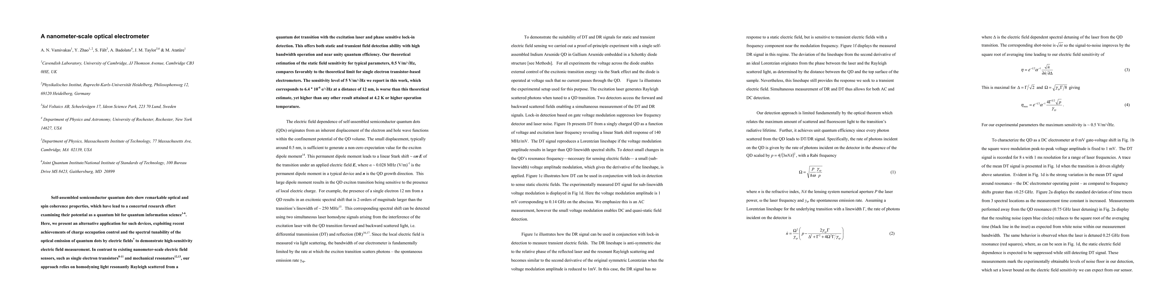 The paper presents a novel nanometer-scale optical electrometer using self-assembled semiconductor quantum dots, demonstrating high-sensitivity electric field measurement. It employs homodyning light resonantly Rayleigh scattered from a quantum dot transition with the excitation laser and phase sensitive lock-in detection, offering high bandwidth operation and near unity quantum efficiency. The reported sensitivity of 5 V/m/u221a Hz at 4.2 K outperforms other results at similar operation temperatures, marking a significant advancement in nanometer-scale electric field sensing.