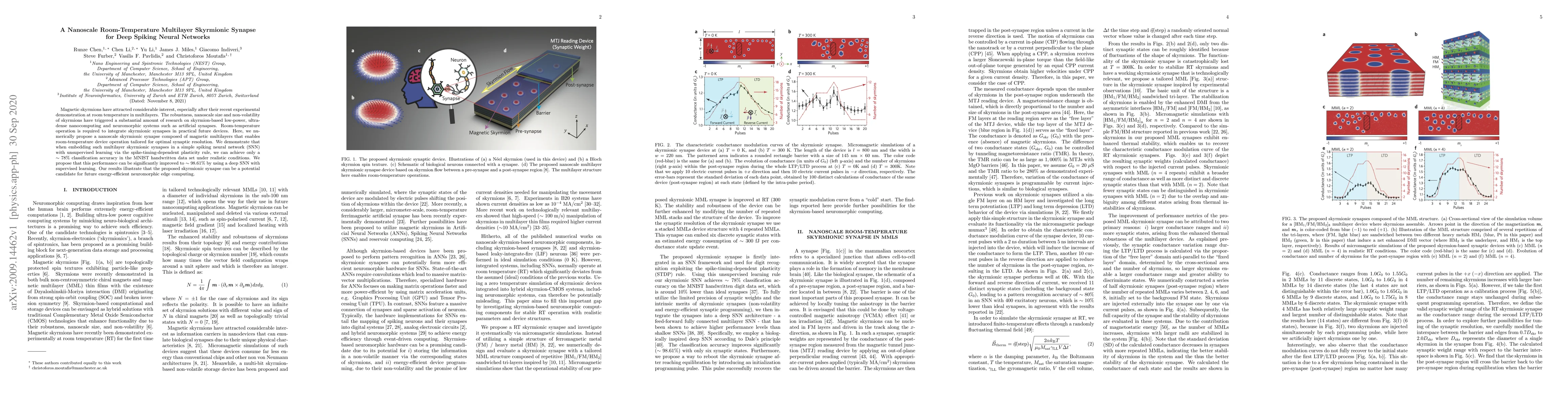 The paper proposes a nanoscale room-temperature multilayer skyrmionic synapse for deep spiking neural networks, achieving 78% classification accuracy in MNIST data with a simple SNN but improving to 98.61% with a deep SNN and supervised learning, highlighting its potential for energy-efficient neuromorphic computing.