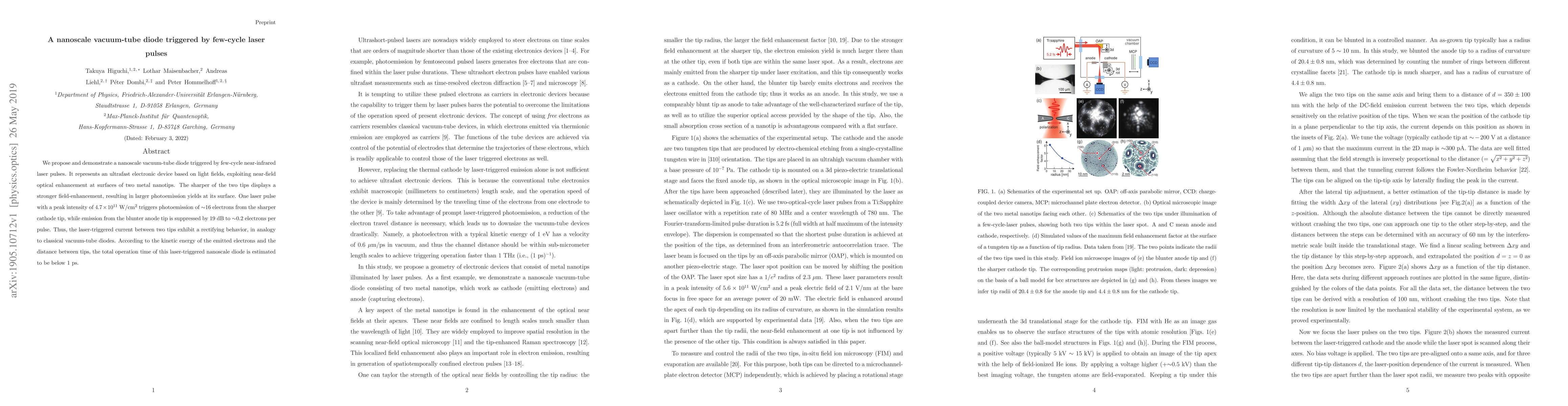 This paper demonstrates a nanoscale vacuum-tube diode activated by few-cycle laser pulses, showing ultrafast electronic behavior through light-field-induced photoemission between two metal nanotips. The sharper tip exhibits significantly higher photoemission, resulting in a rectifying current analogous to classical diodes.
