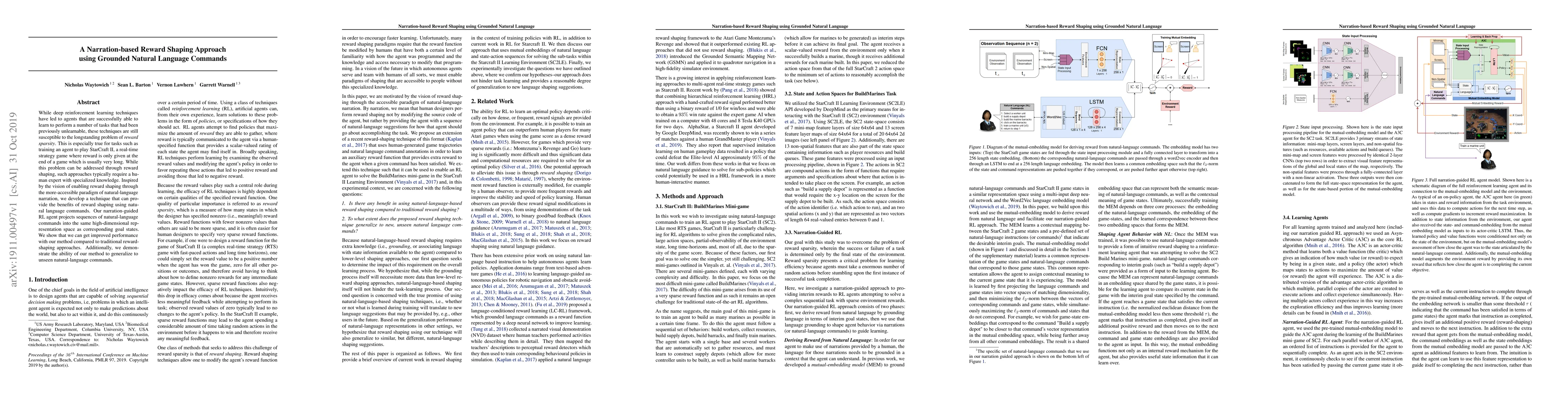 The research proposes a narration-based reward shaping approach using grounded natural language commands for reinforcement learning tasks, specifically addressing the problem of reward sparsity in complex tasks like StarCraft II. The method projects sequences of natural-language commands into the same high-dimensional representation space as corresponding goal states using a mutual-embedding model.
