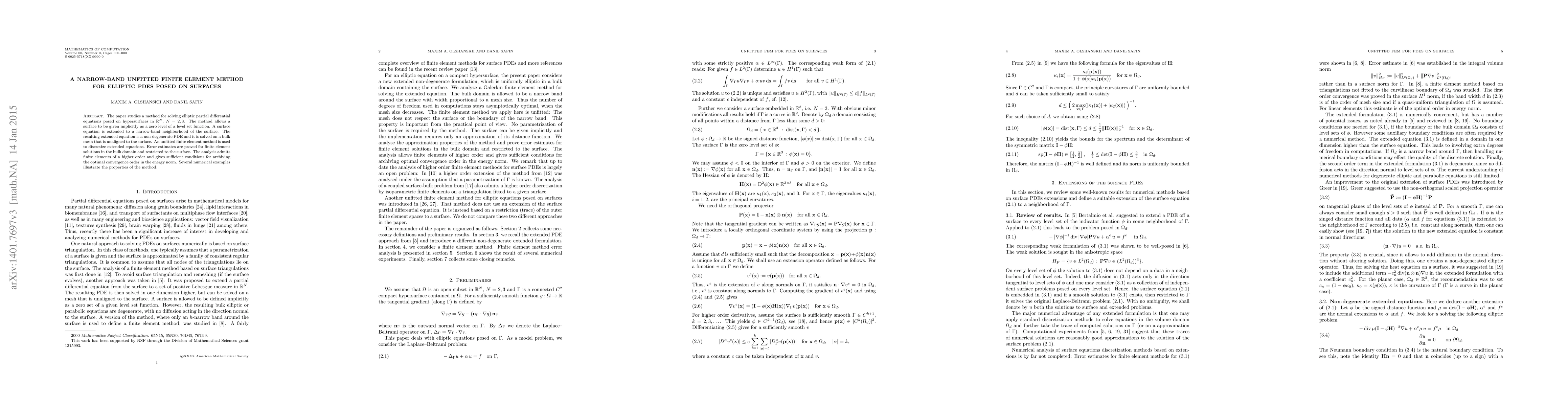 This paper proposes a narrow-band unfitted finite element method for solving elliptic PDEs on surfaces, extending the surface equation to a surrounding region and discretizing it on an unaligned bulk mesh. The method achieves optimal convergence rates and is demonstrated through numerical examples.