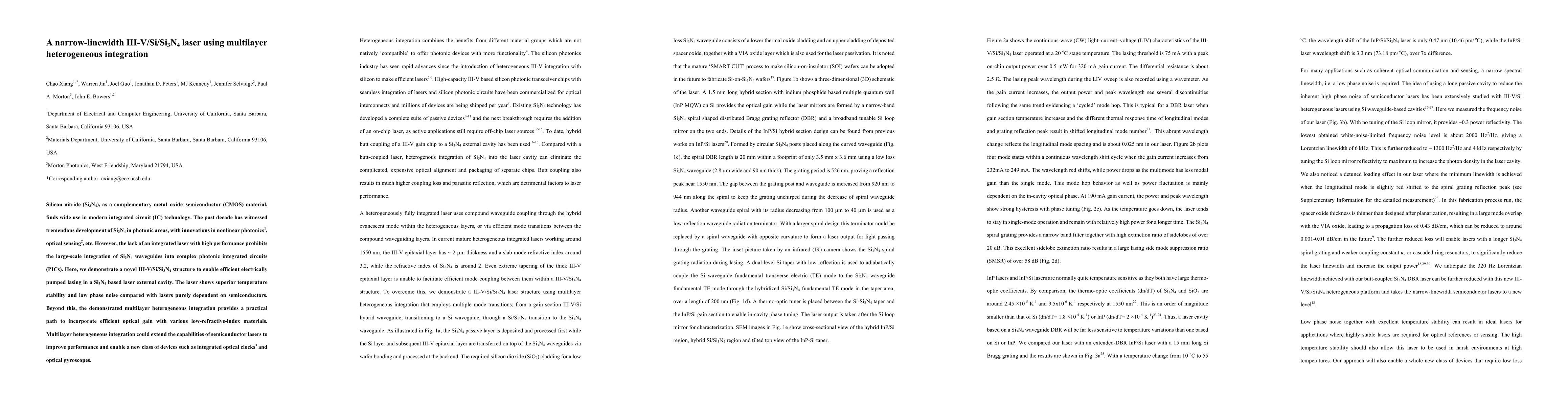 This paper presents a novel III-V/Si/Si3N4 laser structure that enables efficient electrically pumped lasing with superior temperature stability and low phase noise, overcoming the lack of high-performance integrated lasers in Si3N4 waveguides. The multilayer heterogeneous integration method demonstrates a pathway to enhance semiconductor laser performance and open possibilities for advanced devices like integrated optical clocks and gyroscopes.