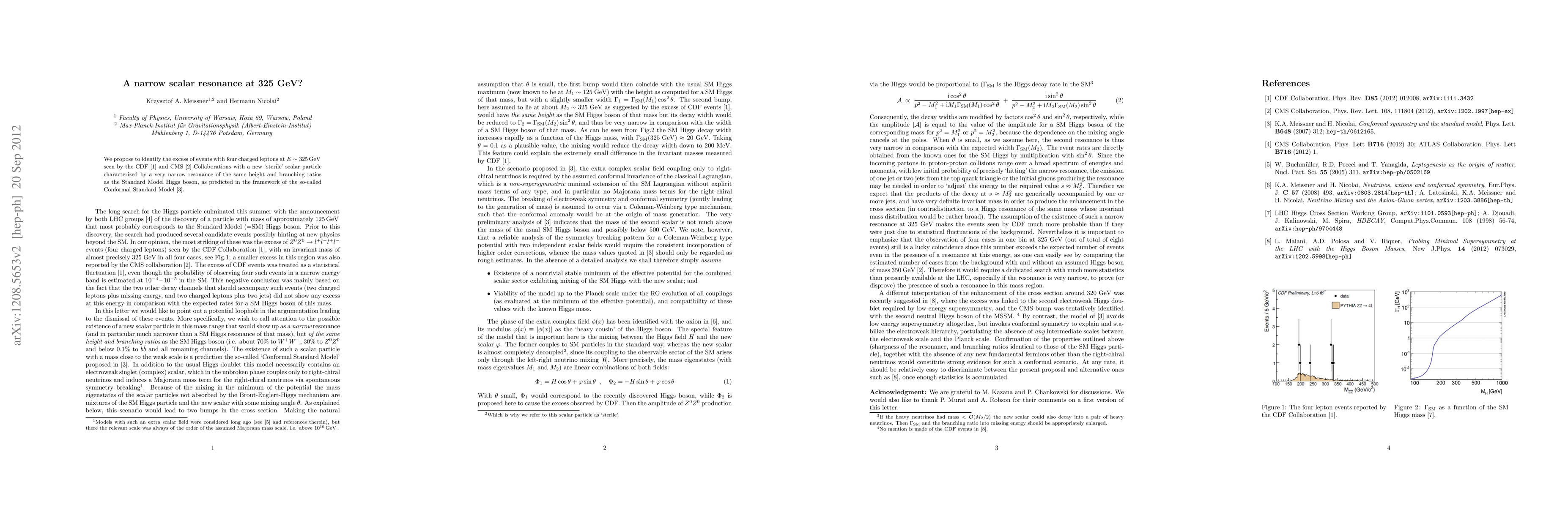 We propose to identify the excess of events with four charged leptons at $E\sim 325\GeV$ seen by the CDF and CMS Collaborations with a new `sterile' scalar particle characterized by a very narrow resonance of the same height and branching ratios as the Standard Model Higgs boson, as predicted in the framework of the so-called Conformal Standard Model