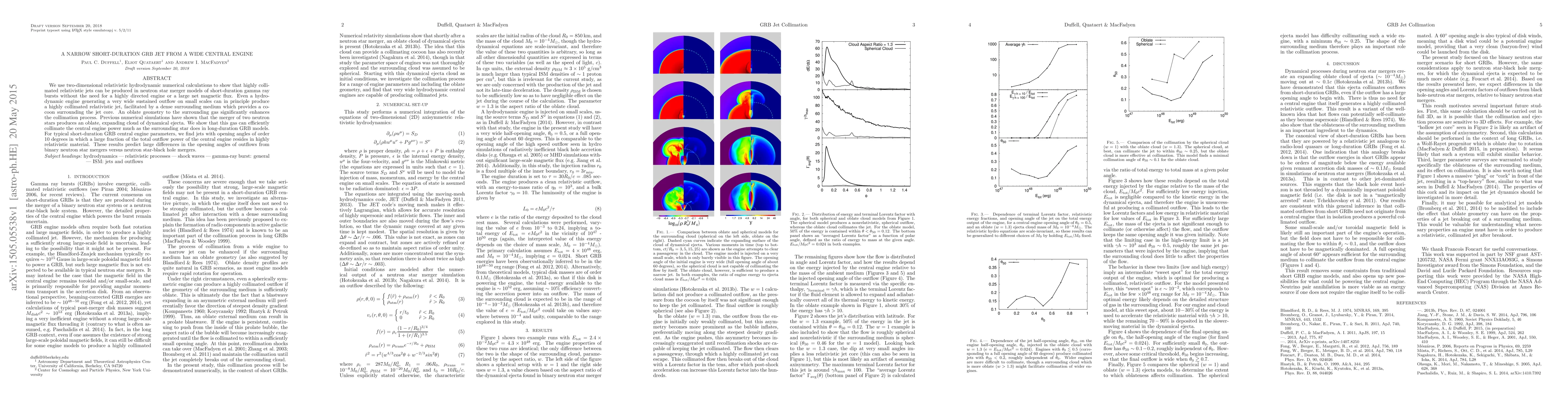 We use two-dimensional relativistic hydrodynamic numerical calculations to show that highly collimated relativistic jets can be produced in neutron star merger models of short-duration gamma ray bursts without the need for a highly directed engine or a large net magnetic flux. Even a hydrodynamic engine generating a very wide sustained outflow on small scales can in principle produce a highly collimated relativistic jet, facilitated by a dense surrounding medium which provides a cocoon surrounding the jet core. An oblate geometry to the surrounding gas significantly enhances the collimation process. Previous numerical simulations have shown that the merger of two neutron stars produces an oblate, expanding cloud of dynamical ejecta. We show that this gas can efficiently collimate the central engine power much as the surrounding star does in long-duration GRB models. For typical short-duration GRB central engine parameters, we find jets with opening angles of order 10 degrees in which a large fraction of the total outflow power of the central engine resides in highly relativistic material. These results predict large differences in the opening angles of outflows from binary neutron star mergers versus neutron star-black hole mergers.