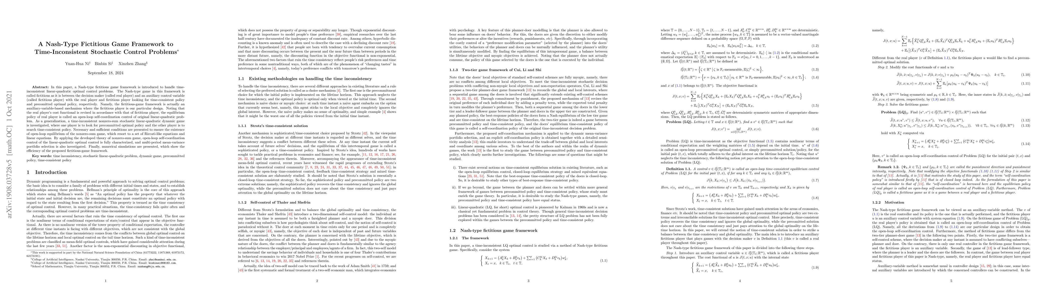 This paper introduces a Nash-type fictitious game framework to address time-inconsistent linear-quadratic optimal control problems, proposing an auxiliary-variable-based mechanism to achieve open-loop self-coordination control. It extends the approach to a nonzero-sum stochastic dynamic game and provides conditions for the existence of open-loop equilibrium, illustrated through numerical simulations.