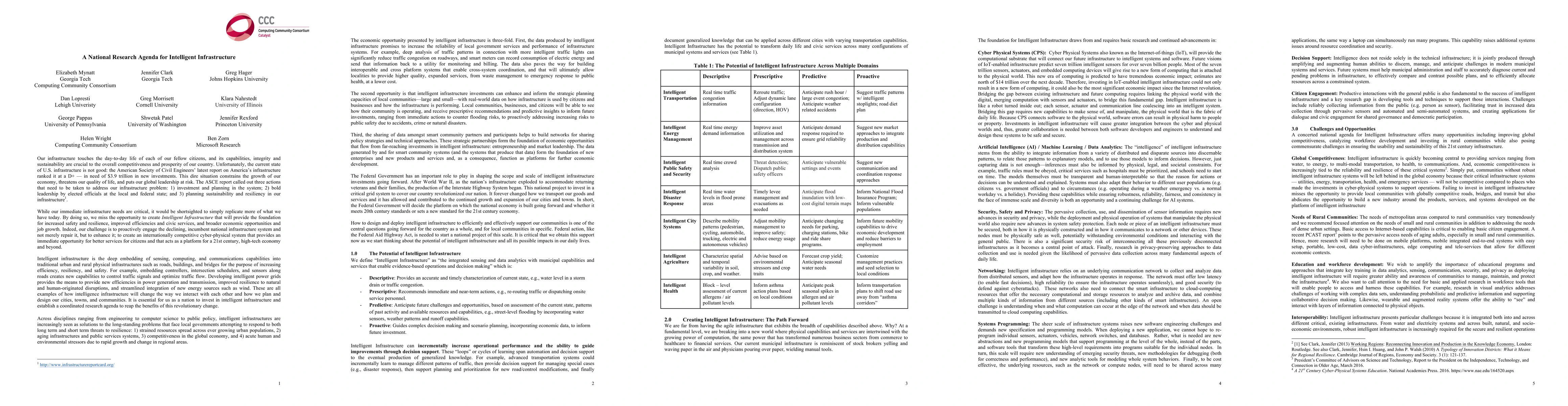 Our infrastructure touches the day-to-day life of each of our fellow citizens, and its capabilities, integrity and sustainability are crucial to the overall competitiveness and prosperity of our country. Unfortunately, the current state of U.S. infrastructure is not good: the American Society of Civil Engineers' latest report on America's infrastructure ranked it at a D+ -- in need of $3.9 trillion in new investments. This dire situation constrains the growth of our economy, threatens our quality of life, and puts our global leadership at risk. The ASCE report called out three actions that need to be taken to address our infrastructure problem: 1) investment and planning in the system; 2) bold leadership by elected officials at the local and federal state; and 3) planning sustainability and resiliency in our infrastructure. While our immediate infrastructure needs are critical, it would be shortsighted to simply replicate more of what we have today. By doing so, we miss the opportunity to create Intelligent Infrastructure that will provide the foundation for increased safety and resilience, improved efficiencies and civic services, and broader economic opportunities and job growth. Indeed, our challenge is to proactively engage the declining, incumbent national infrastructure system and not merely repair it, but to enhance it; to create an internationally competitive cyber-physical system that provides an immediate opportunity for better services for citizens and that acts as a platform for a 21st century, high-tech economy and beyond.