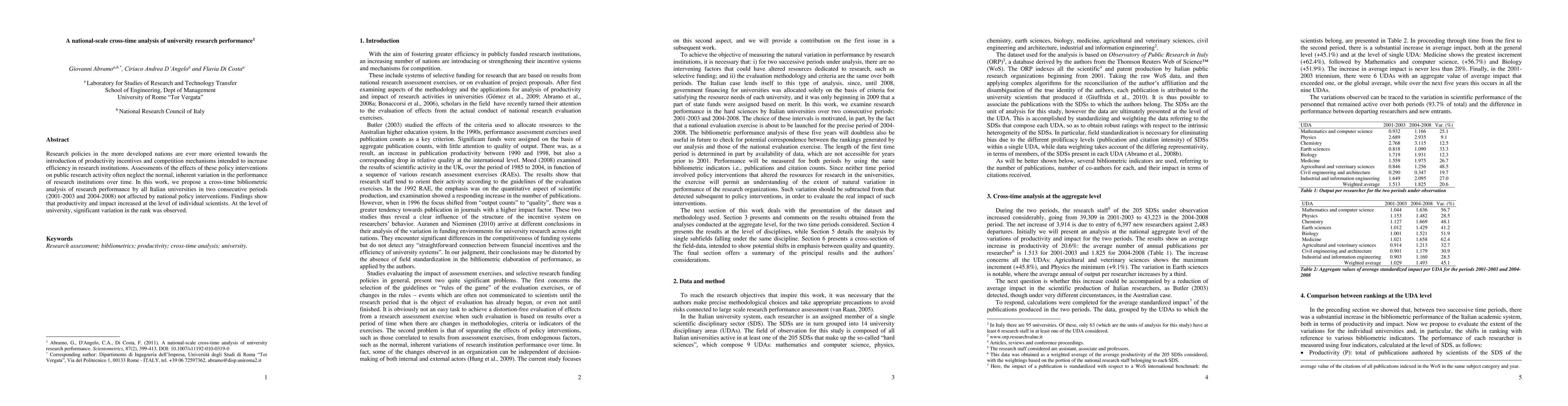 This study conducts a cross-time bibliometric analysis of Italian universities' research performance over two periods (2001-2003 and 2004-2008), finding increased productivity and impact per scientist, while universities exhibited significant rank variation.