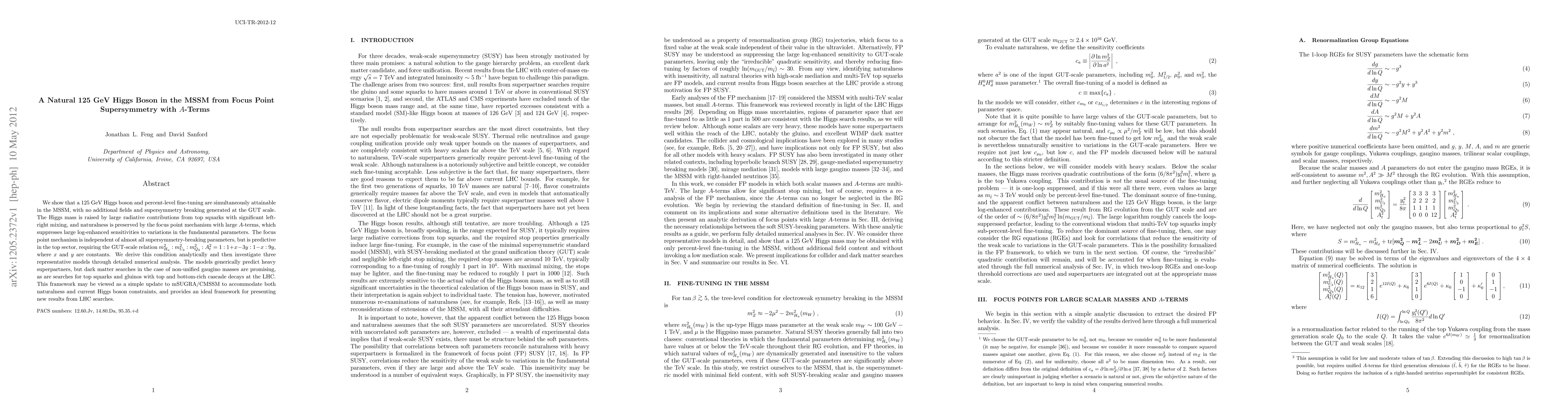 We show that a 125 GeV Higgs boson and percent-level fine-tuning are simultaneously attainable in the MSSM, with no additional fields and supersymmetry breaking generated at the GUT scale. The Higgs mass is raised by large radiative contributions from top squarks with significant left-right mixing, and naturalness is preserved by the focus point mechanism with large $A$-terms, which suppresses large log-enhanced sensitivities to variations in the fundamental parameters. The focus point mechanism is independent of almost all supersymmetry-breaking parameters, but is predictive in the top sector, requiring the GUT-scale relation $m_{H_u}^2 : m_{\bar{U}_3}^2 : m_{Q_3}^2 : A_t^2 = 1 : 1+x - 3y : 1-x : 9y$, where $x$ and $y$ are constants. We derive this condition analytically and then investigate three representative models through detailed numerical analysis. The models generically predict heavy superpartners, but dark matter searches in the case of non-unified gaugino masses are promising, as are searches for top squarks and gluinos with top and bottom-rich cascade decays at the LHC. This framework may be viewed as a simple update to mSUGRA/CMSSM to accommodate both naturalness and current Higgs boson constraints, and provides an ideal framework for presenting new results from LHC searches.