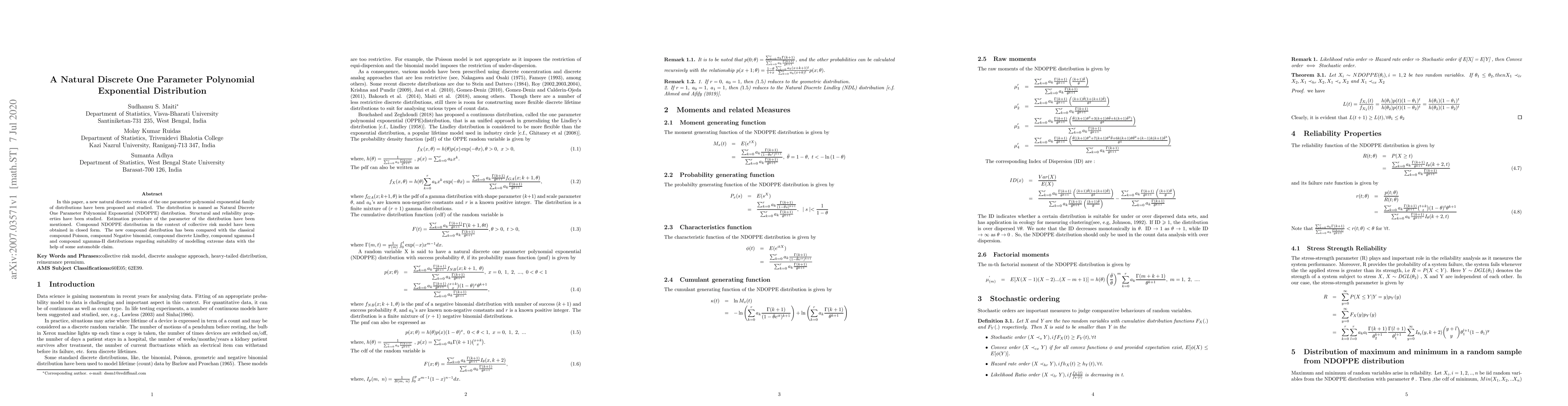 This paper introduces the Natural Discrete One Parameter Polynomial Exponential (NDOPPE) distribution, studying its structural and reliability properties, and proposing an estimation procedure for its parameter. The paper also derives a compound NDOPPE distribution in a collective risk model and compares it with other compound distributions for modeling extreme data, using automobile claim data for validation.