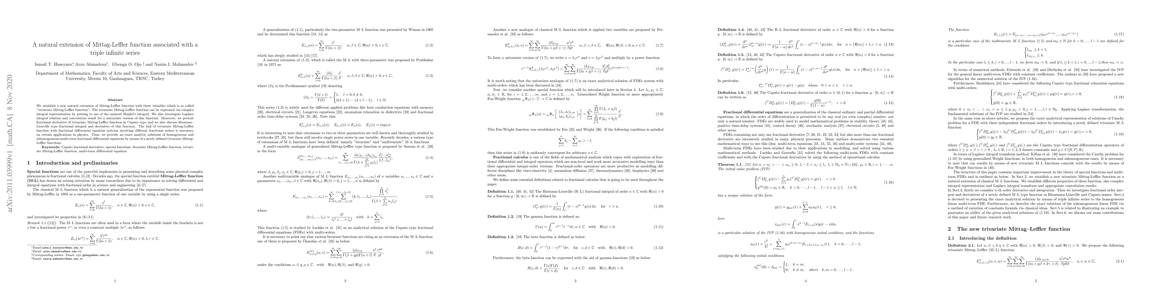 We establish a new natural extension of Mittag-Leffler function with three variables which is so called "trivariate Mittag-Leffler function". The trivariate Mittag-Leffler function can be expressed via complex integral representation by putting to use of the eminent Hankel's integral. We also investigate Laplace integral relation and convolution result for a univariate version of this function. Moreover, we present fractional derivative of trivariate Mittag-Leffler function in Caputo type and we also discuss Riemann- Liouville type fractional integral and derivative of this function. The link of trivariate Mittag-Leffler function with fractional differential equation systems involving different fractional orders is necessary on certain applications in physics. Thus, we provide an exact analytic solutions of homogeneous and inhomogeneous multi-term fractional differential equations by means of a newly defined trivariate Mittag-Leffler functions.