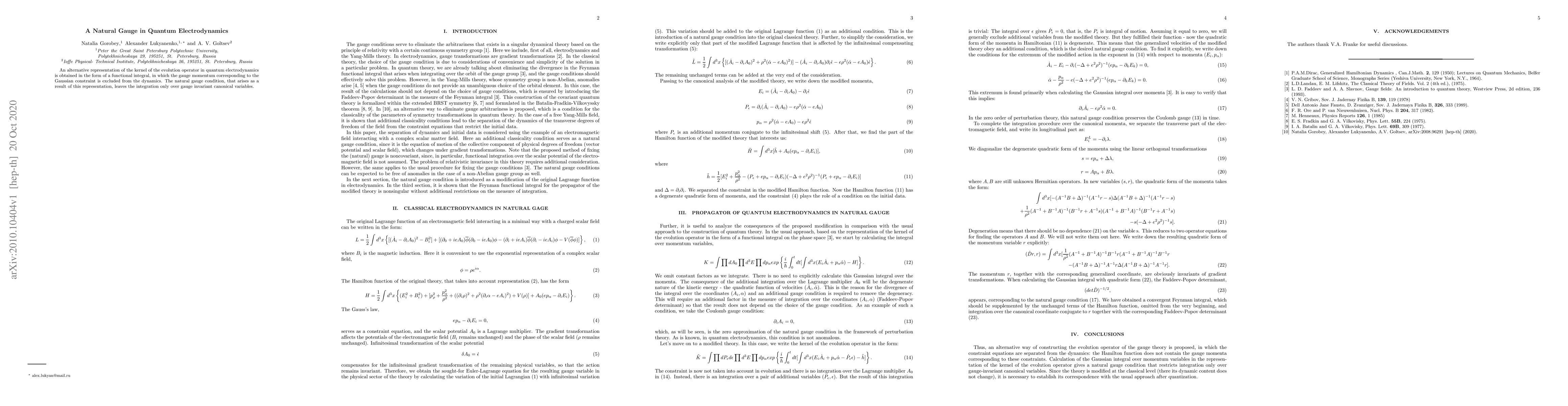 An alternative representation of the kernel of the evolution operator in quantum electrodynamics is obtained in the form of a functional integral, in which the gauge momentum corresponding to the Gaussian constraint is excluded from the dynamics. The natural gauge condition, that arises as a result of this representation, leaves the integration only over gauge invariant canonical variables.