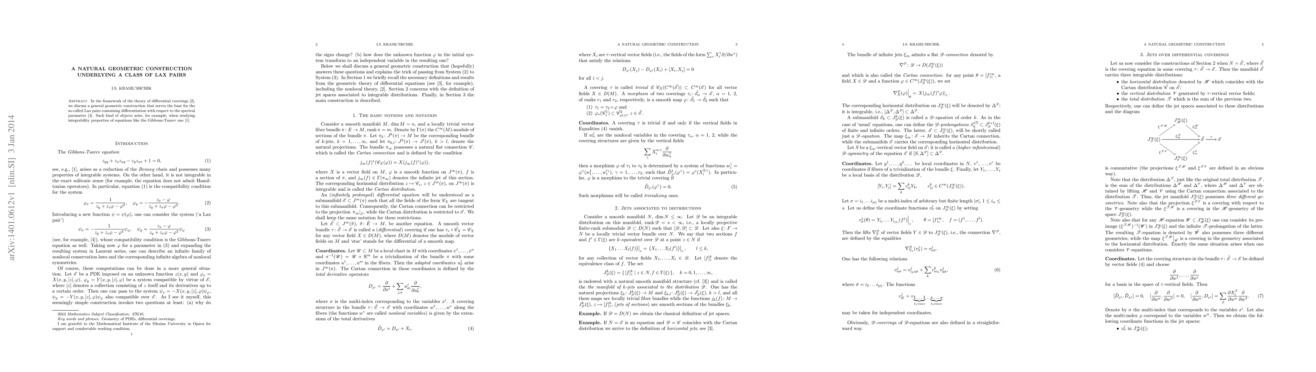 In the framework of the theory of differential coverings \cite{KV}, we discuss a general geometric construction that serves the base for the so-called Lax pairs containing differentiation with respect to the spectral parameter \cite{OS}. Such kind of objects arise, for example, when studying integrability properties of equations like the Gibbons-Tsarev one \cite{GT}.