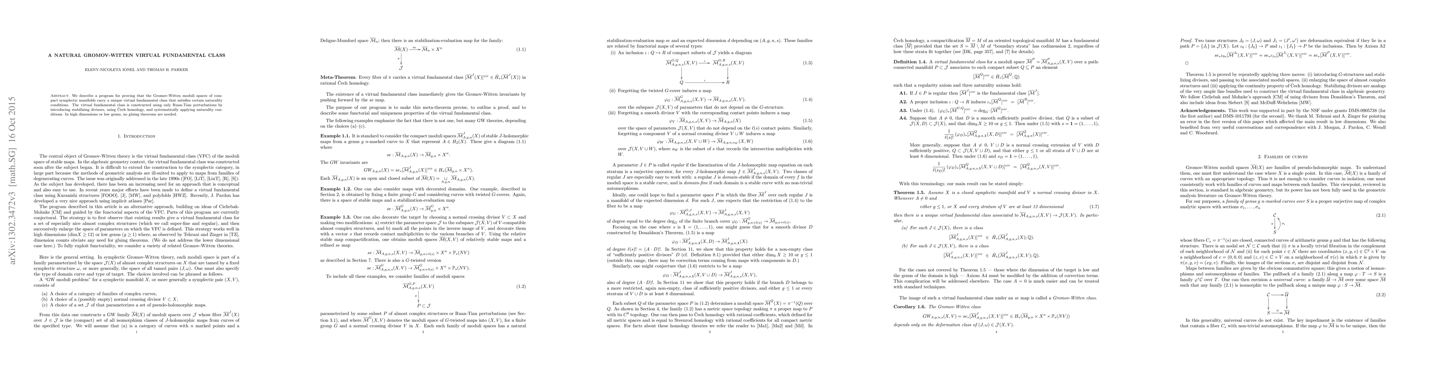 We describe a program for proving that the Gromov-Witten moduli spaces of compact symplectic manifolds carry a unique virtual fundamental class that satisfies certain naturality conditions. The virtual fundamental class is constructed using only Ruan-Tian perturbations by introducing stabilizing divisors, using Cech homology, and systematically applying naturality conditions. In high dimensions or low genus, no gluing theorems are needed.