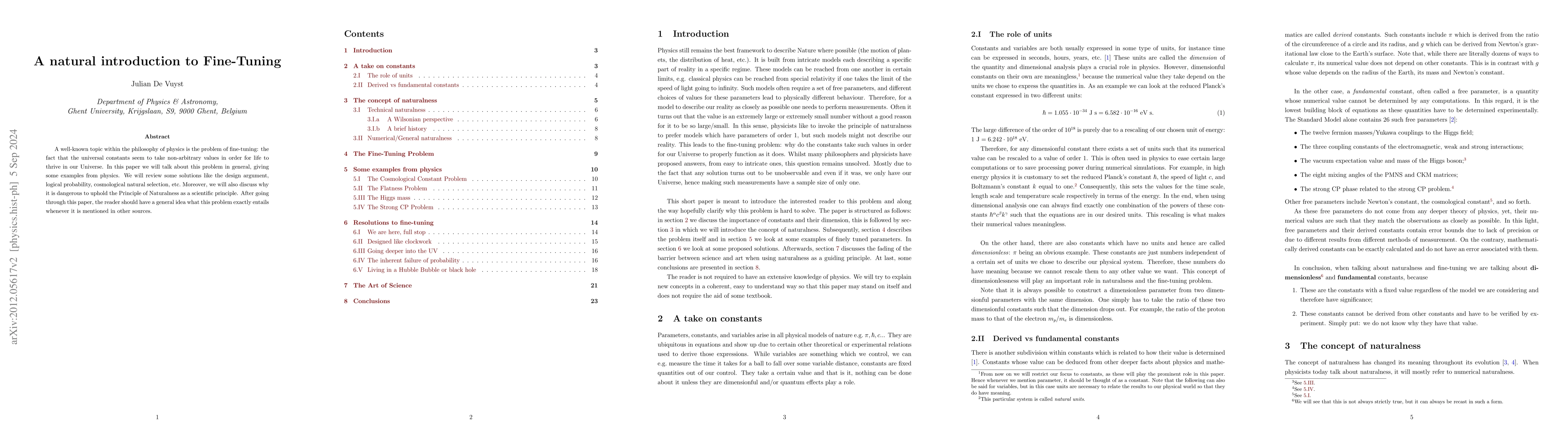 A well-known topic within the philosophy of physics is the problem of fine-tuning: the fact that the universal constants seem to take non-arbitrary values in order for live to thrive in our Universe. In this paper we will talk about this problem in general, giving some examples from physics. We will review some solutions like the design argument, logical probability, cosmological natural selection, etc. Moreover, we will also discuss why it's dangerous to uphold the Principle of Naturalness as a scientific principle. After going through this paper, the reader should have a general idea what this problem exactly entails whenever it is mentioned in other sources and we recommend the reader to think critically about these concepts.