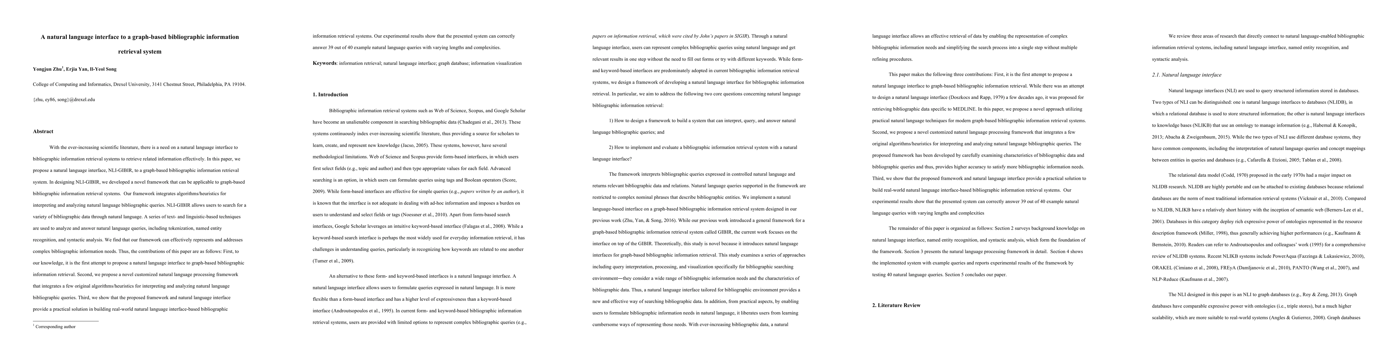 This paper proposes NLI-GIBIR, a natural language interface for a graph-based bibliographic information retrieval system, featuring a novel framework with algorithms for interpreting natural language queries. Experimental results show the system correctly answers 39 out of 40 example queries, indicating its practical viability.