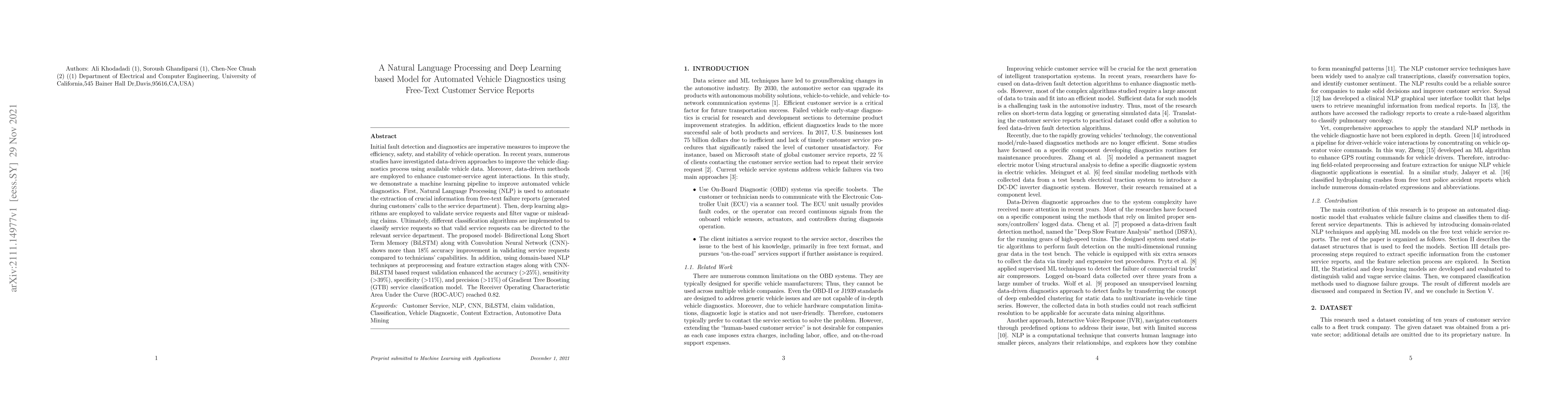 This study presents a machine learning model combining NLP and deep learning to automate vehicle diagnostics using free-text customer service reports. The BiLSTM-CNN model shows an 18% accuracy improvement over technicians in validating service requests, while enhancing the Gradient Tree Boosting classification model's accuracy, sensitivity, specificity, and precision by over 25%, 39%, 11%, and 11% respectively, with a ROC-AUC of 0.82.