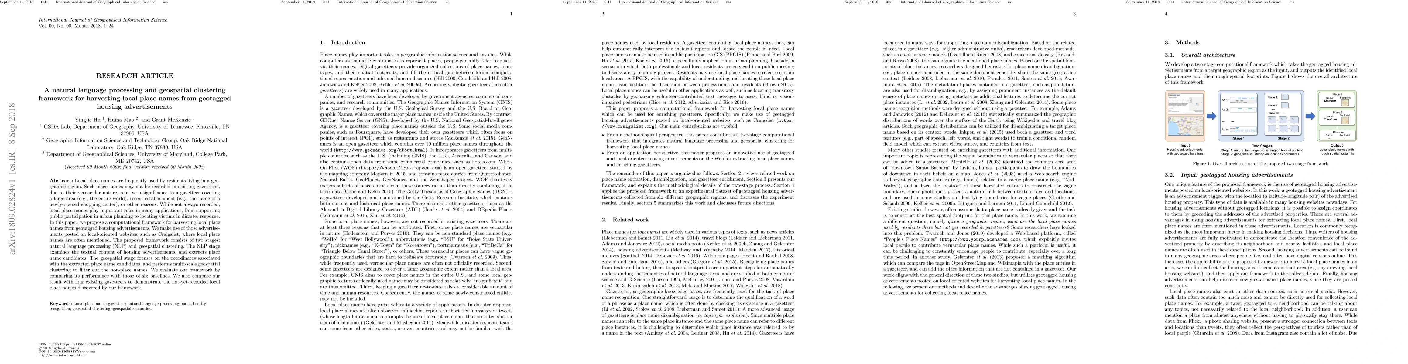This paper proposes a framework combining NLP and geospatial clustering to extract local place names from geotagged housing advertisements. The NLP stage identifies place name candidates, while the geospatial clustering stage refines the results, revealing vernacular place names not recorded in existing gazetteers.